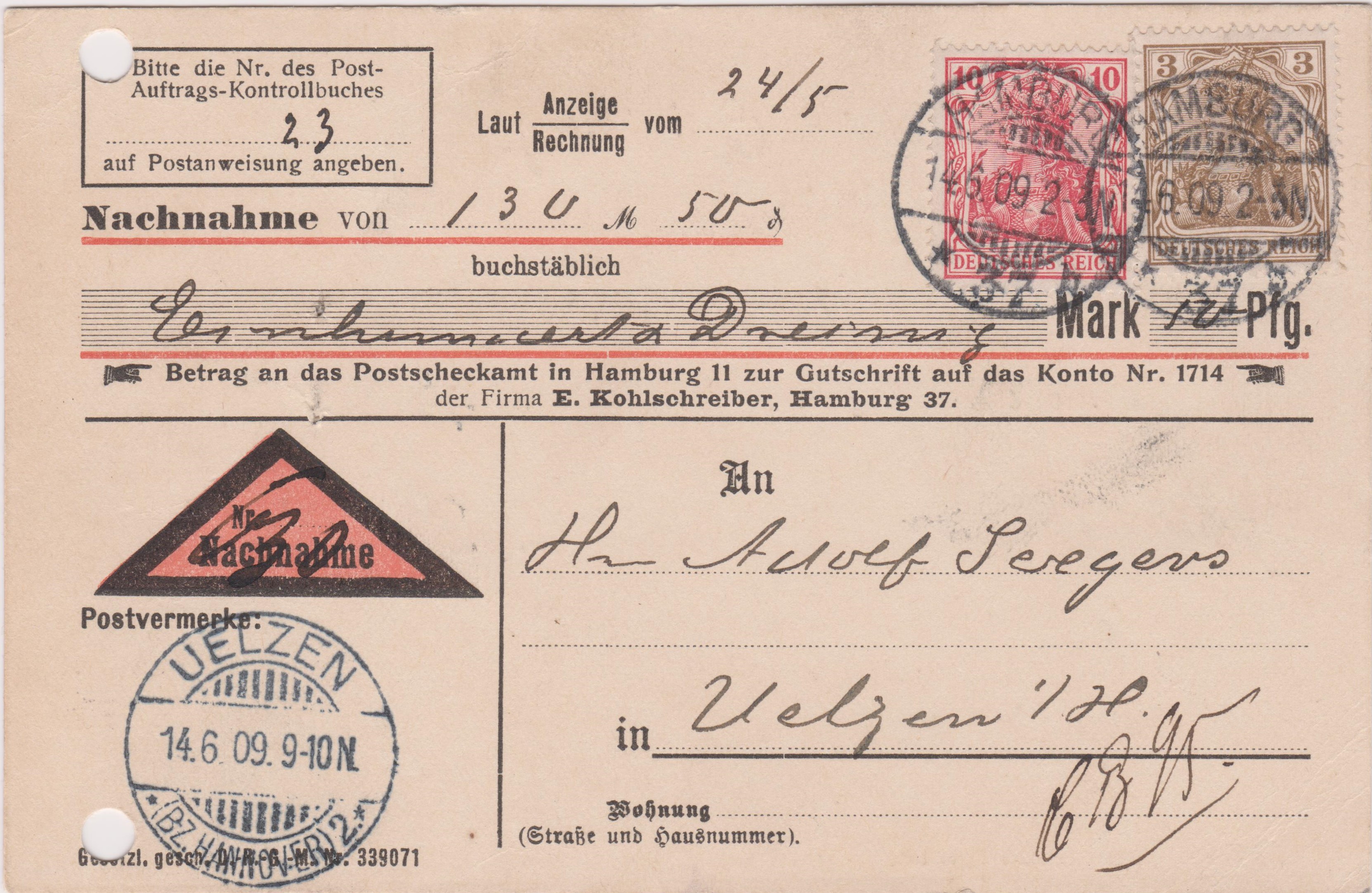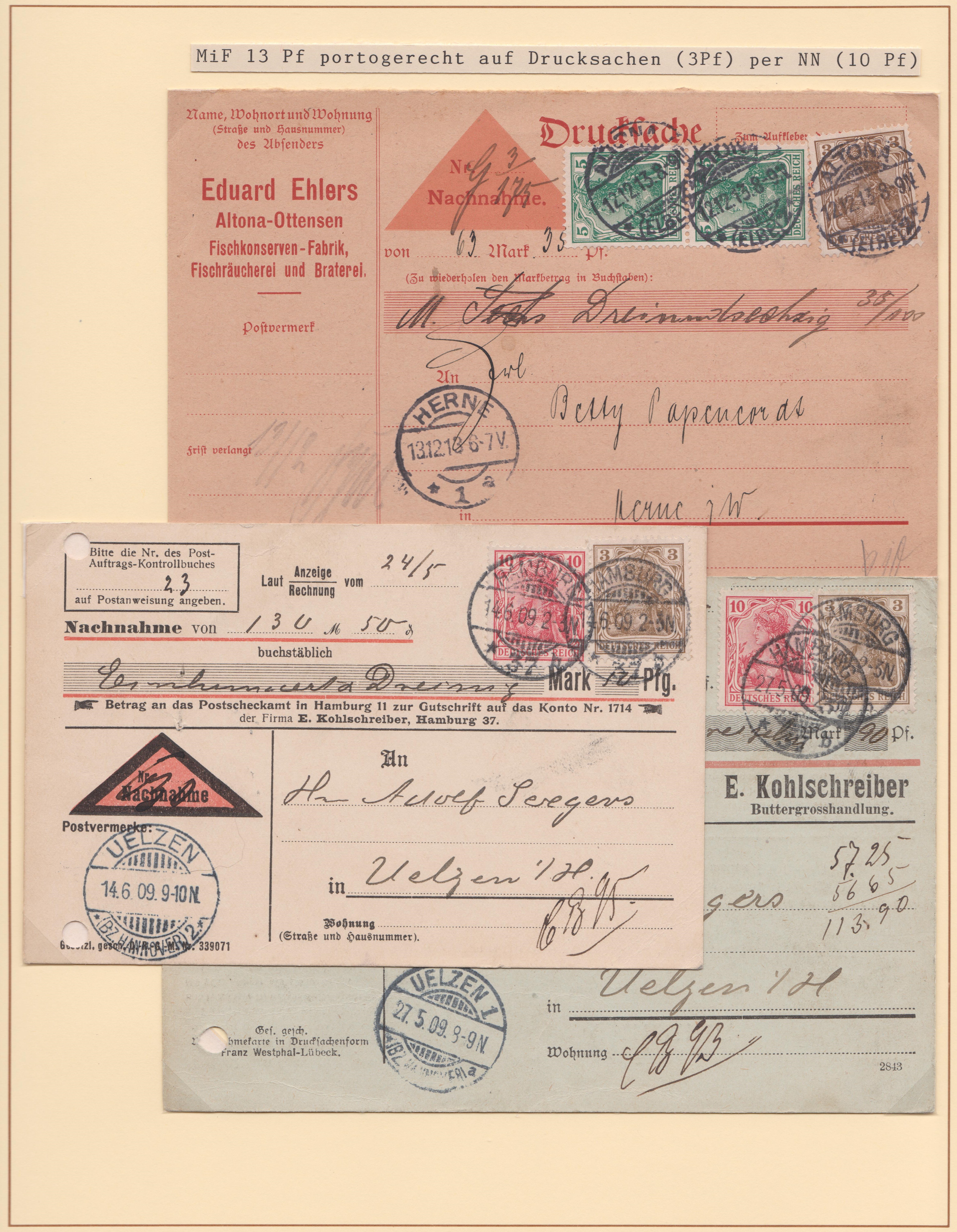 Portostufe 13 Pf, portogerecht für eine Drucksache, 3 Pf, per Nachnahme, 10 Pf: