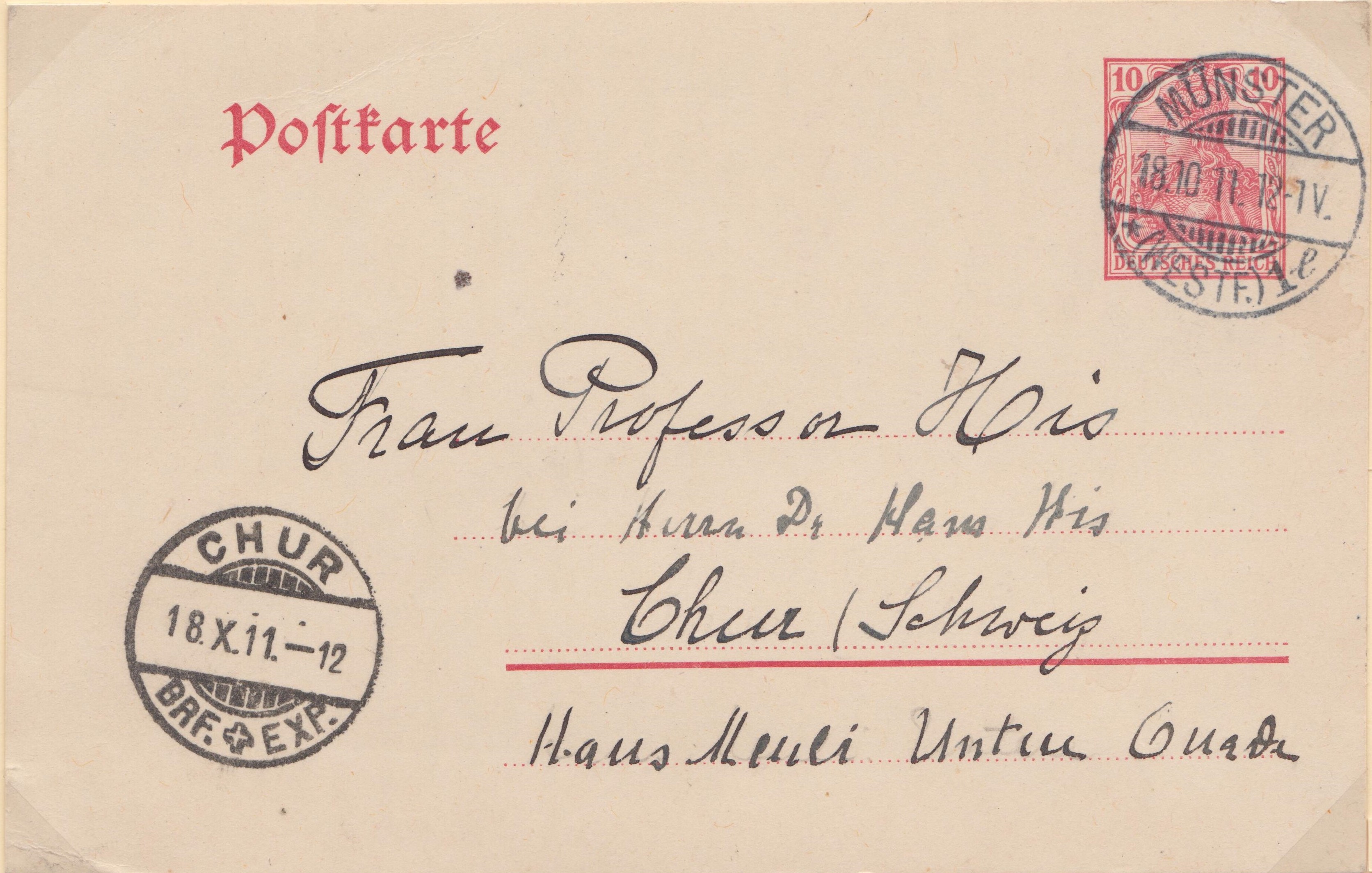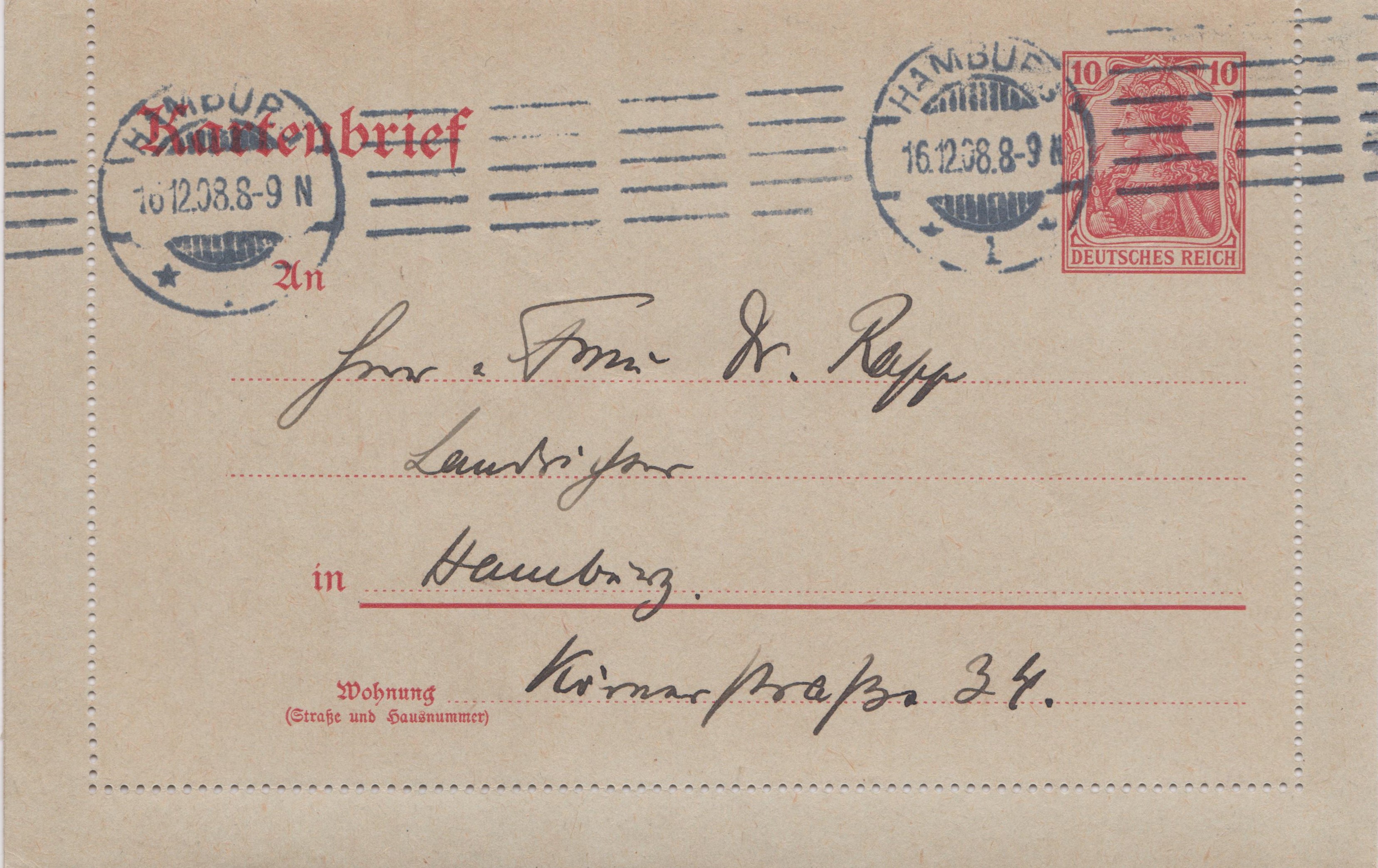 Ganzsache MICHEL P 89 mit eingedrucktem Postwertzeichen Germania 3 Pf und Zusatzfrankatur Germania 5 Pf am 27.04.1913 aufgegeben in STUTTGART, gelaufen nach Giessen: