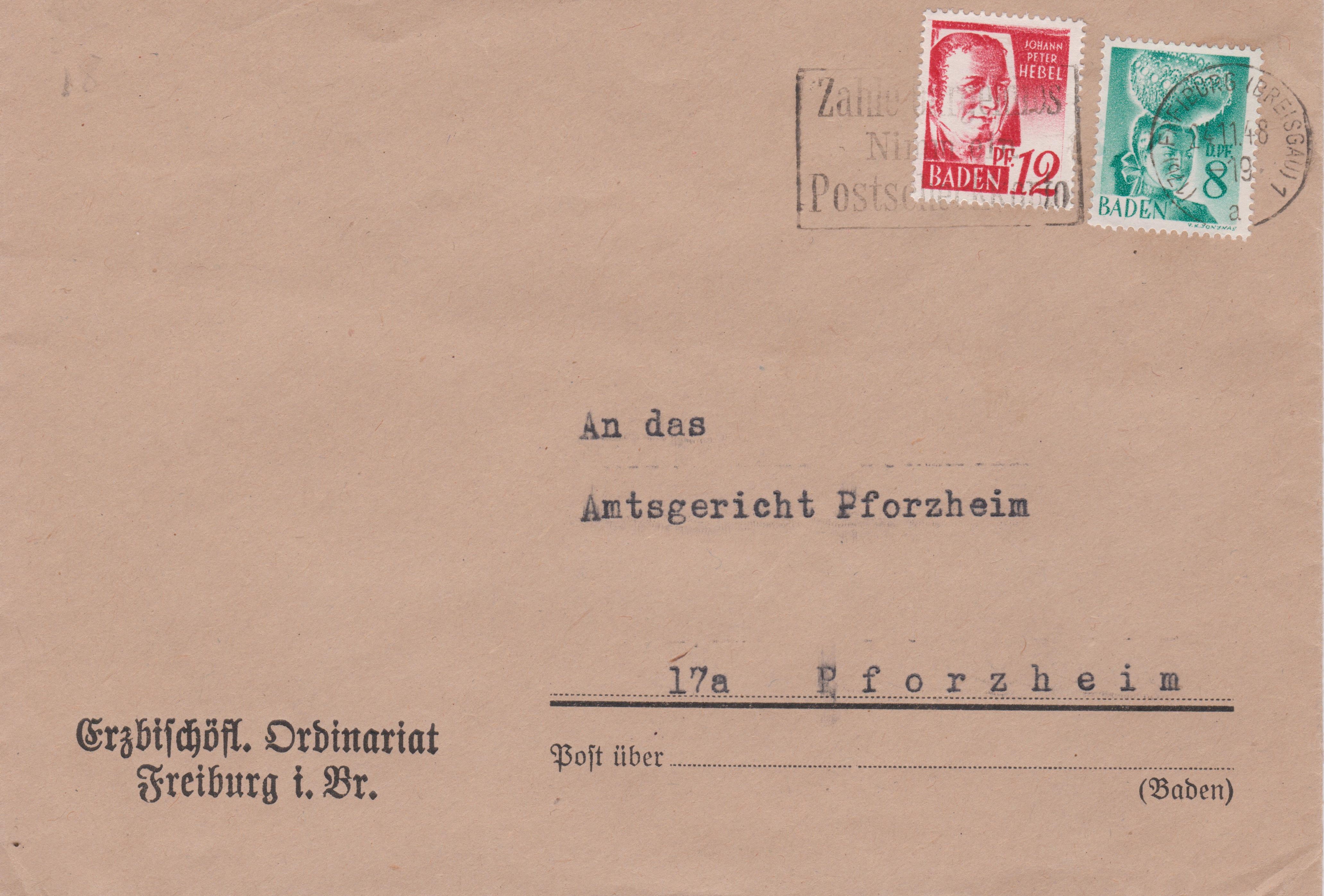 Mischfrankatur Baden MiNr. 18 mit Baden MiNr. 16 am 24.11.1948 portogerecht auf Brief im Fernverkehr von Freiburg nach Pforzheim: