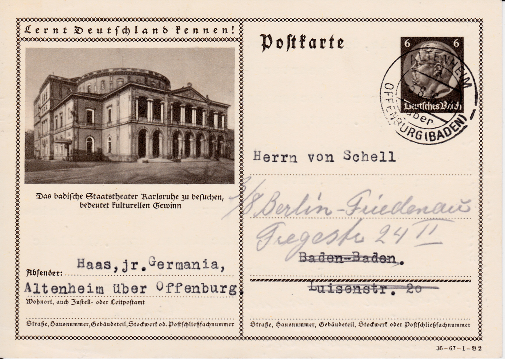 Dieser Jahrgang beginnt mit der Karte mit dem Badischen Staatstheater in Karlsruhe und dem Druckvermerk 36-67-1-B1 (Serie 67 Bild 1).