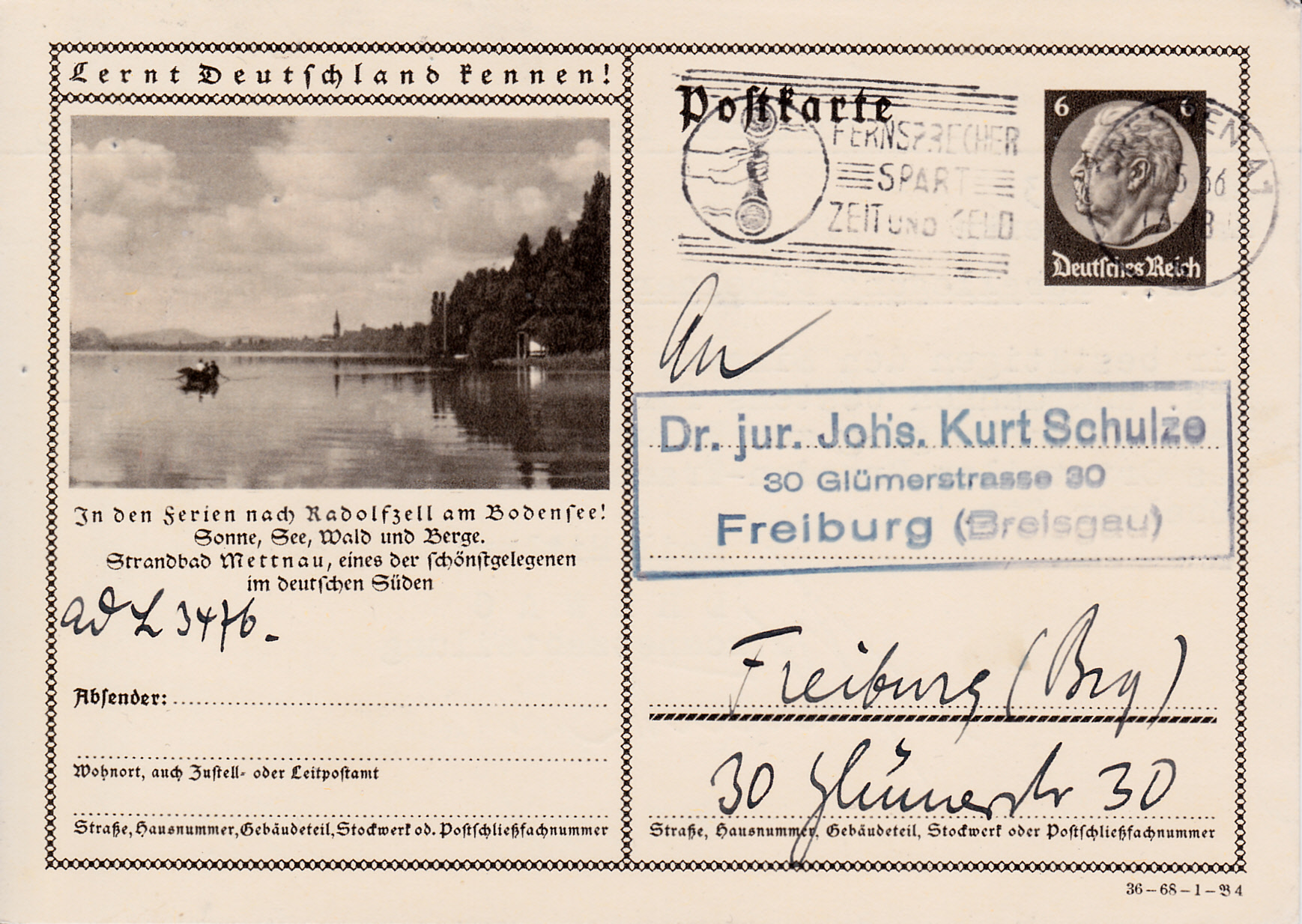 Diese Karte (Serie 68 Bild 9) wiederholt ein Foto aus Meersburg aus der Bildpostkartenserie 1933 (MiNr P 221/54).