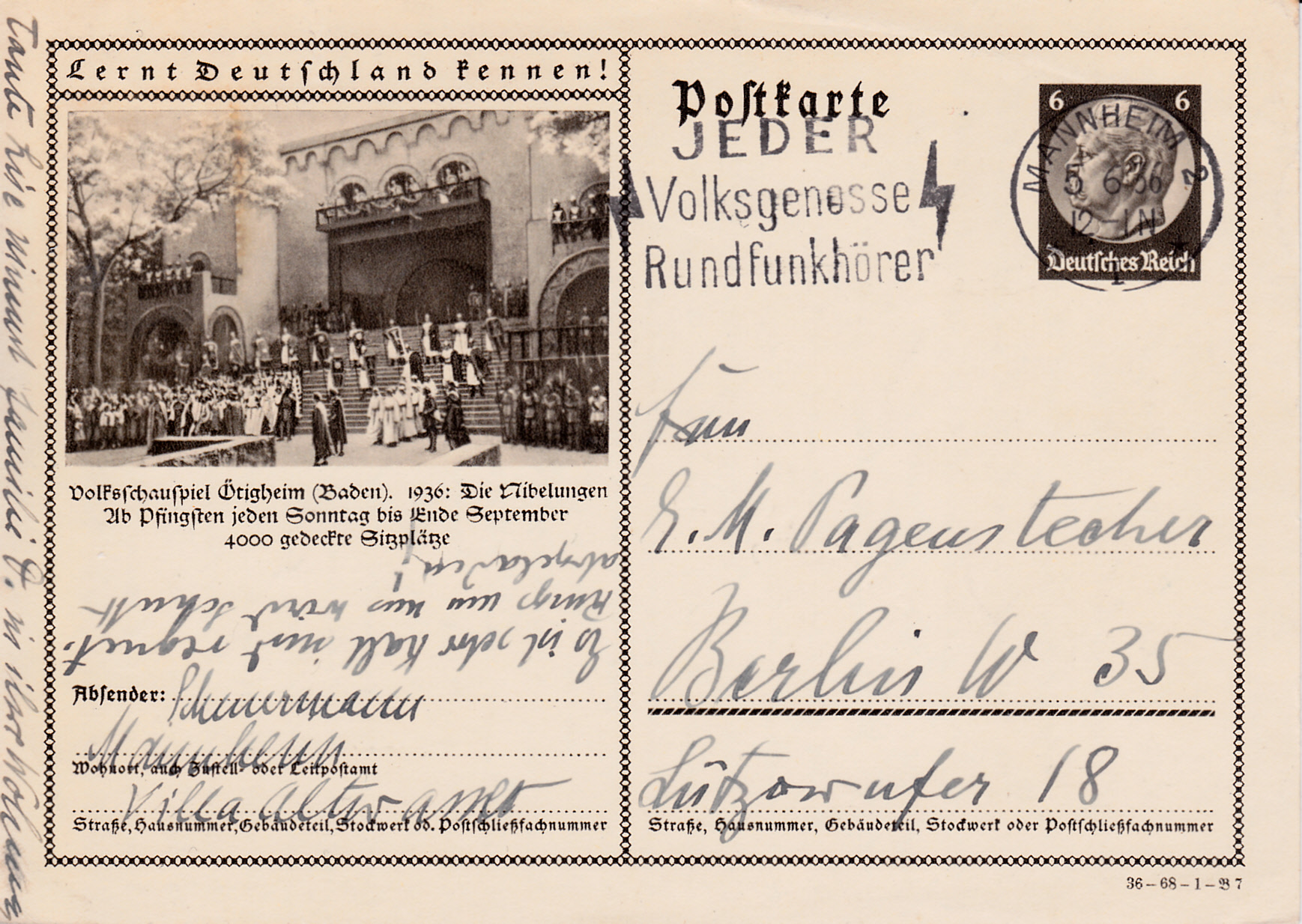Ötigheim (Baden) wirbt auf dieser Karte (Serie 68 Bild 7) für eine Aufführung "Die Nibelungen" in der Freilichtbühne Ötigheim.