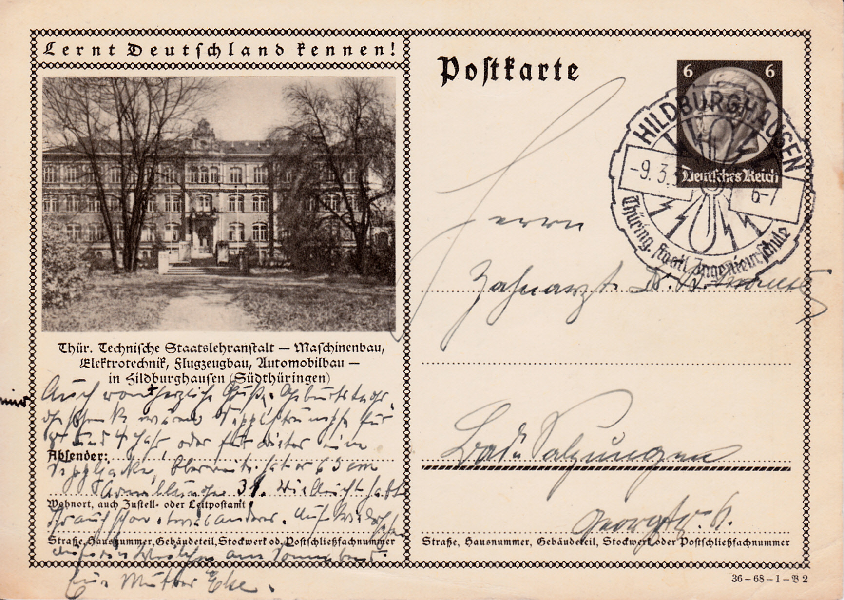 Hildburghausen zeigt auf dieser Karte (Serie 68 Bild 2) die Technische Staatslehranstalt in Hildburghausen. Der Handwerbestempel verweist ebenfalls auf diese Ingenieurschule.