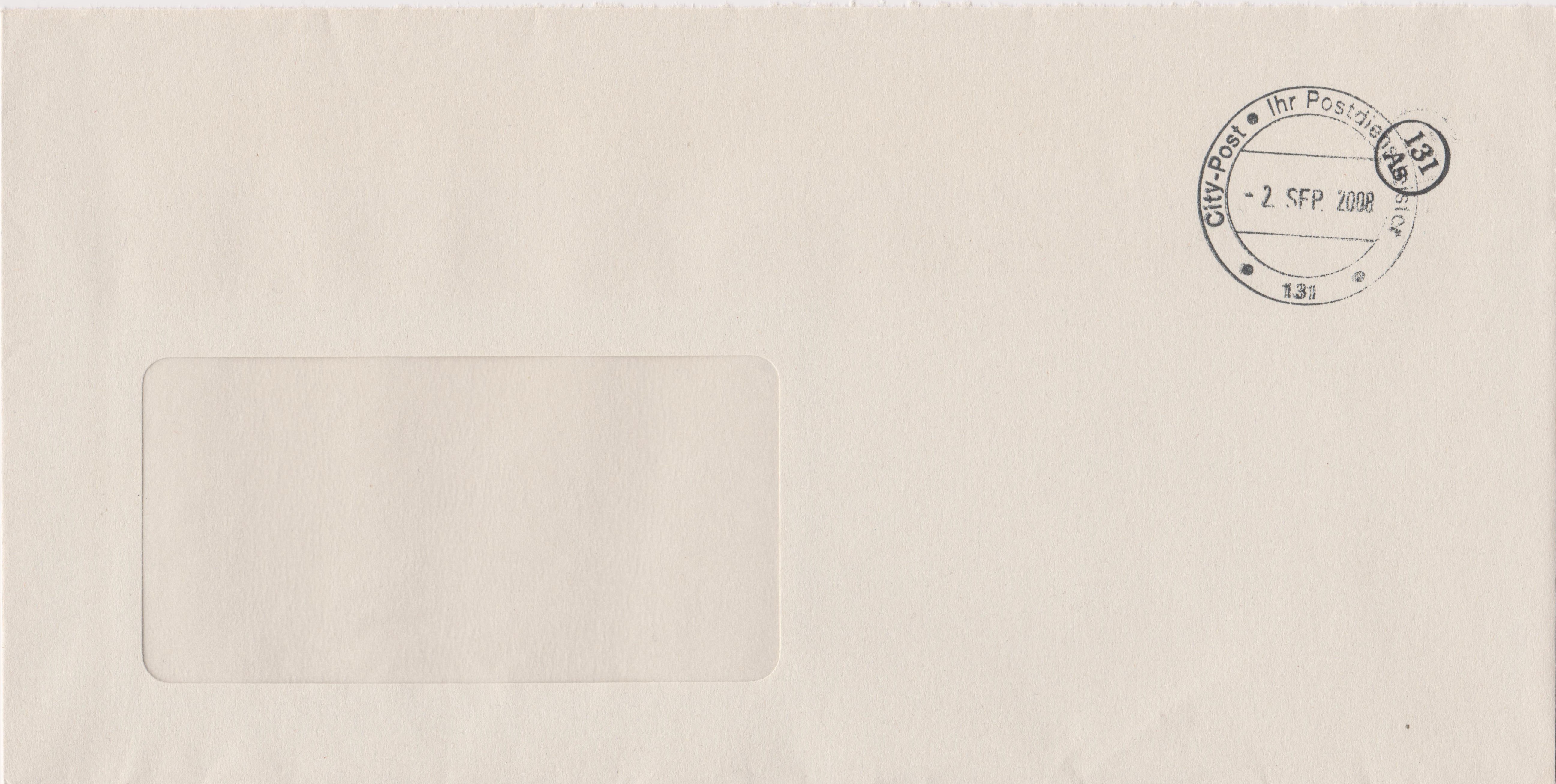 Brief vom 08.09.2008 mit Zweikreisstegstempel "City-Post Ihr Postdienstleister 131" sowie Fingerhutstempel "131 Ap":