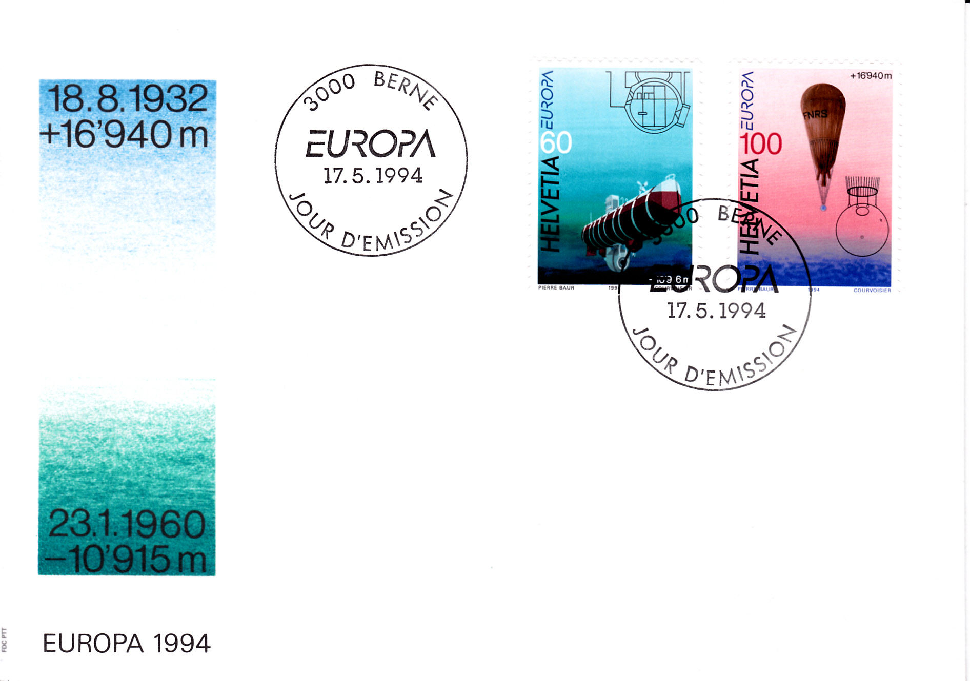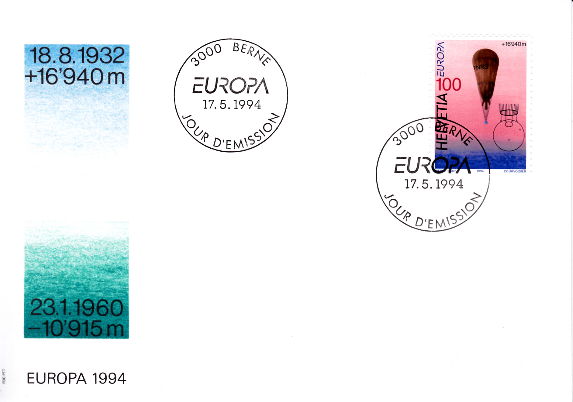 In der Schweiz erschienen die Europamarken 1994 zum Gemeinschaftsthema "Entdeckungen und Erfindungen" am 17. Mai 1994. Hier der Wert zu 100 Rappen mit einer Darstellung zum ersten bemannten Stratosphärenflug durch Auguste Piccard (1884–1962, Physiker). Im Markenbild wird der Stratosphärenballon "FNRS" gezeigt. Die Marke erschien in einer Auflage von 5.610.000 Stück.