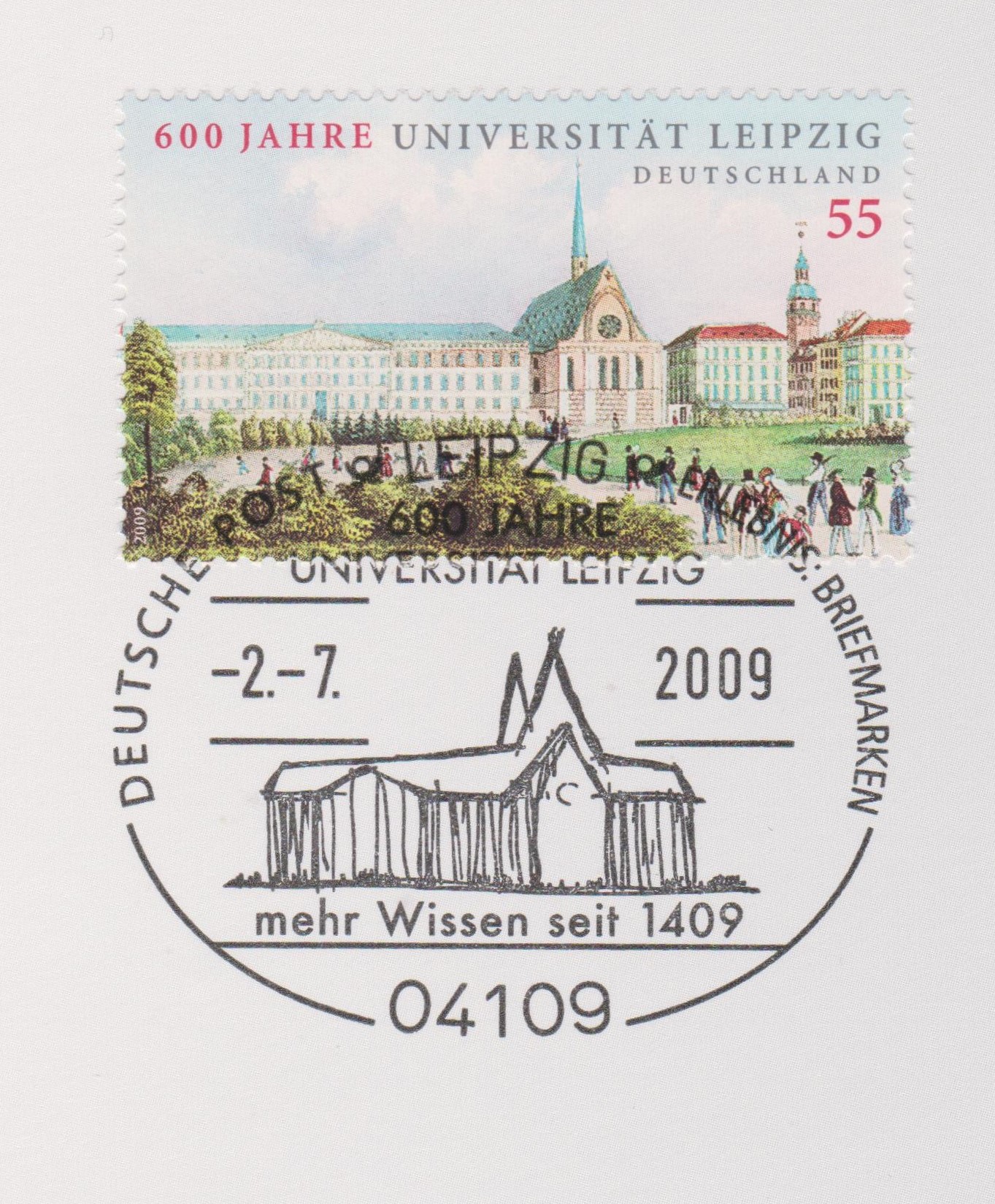Zum Jubiläum "600 Jahre Universität Leipzig" erschien am 02.07.2009 diese Sondermarke, hier mit thematisch passendem Sonderstempel entwertet auf Blatt 30 der "Deutsche Post Stempelsammlung 2009":