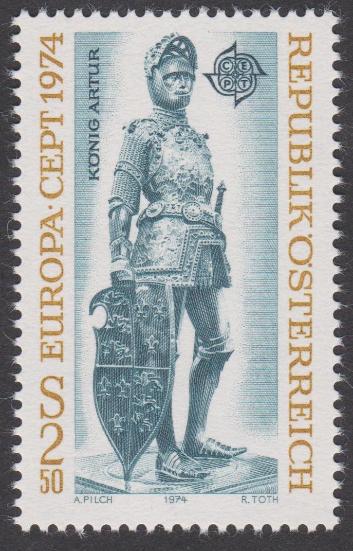 Dieses Postwertzeichen aus Österreich (MiNr 1450) zeigt König Artur, Statue aus dem Grab von Maximilian I, Innsbruck, 1513 (Bronze):