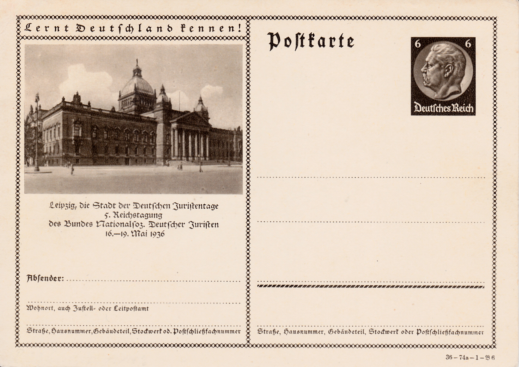 Mit Bildpostkarten machte Leipzig auf die 5. Reichstagung des Bundes Nationalsoz. Deutscher Juristen vom 16.-19. Mai 21936 aufmerksam. Die Abbildung zeigt das Gebäude des ehemaligen Reichsgerichts (Heute Sitz des Bundesverwaltungsgerichts) in Leipzig. Die Karteb gibt es mit mehreren Druckvermerken. Hier zeige ich die Karte mit dem Druckvermerk "36-74a-1-B 4" (Serie 74a Bild 4).
