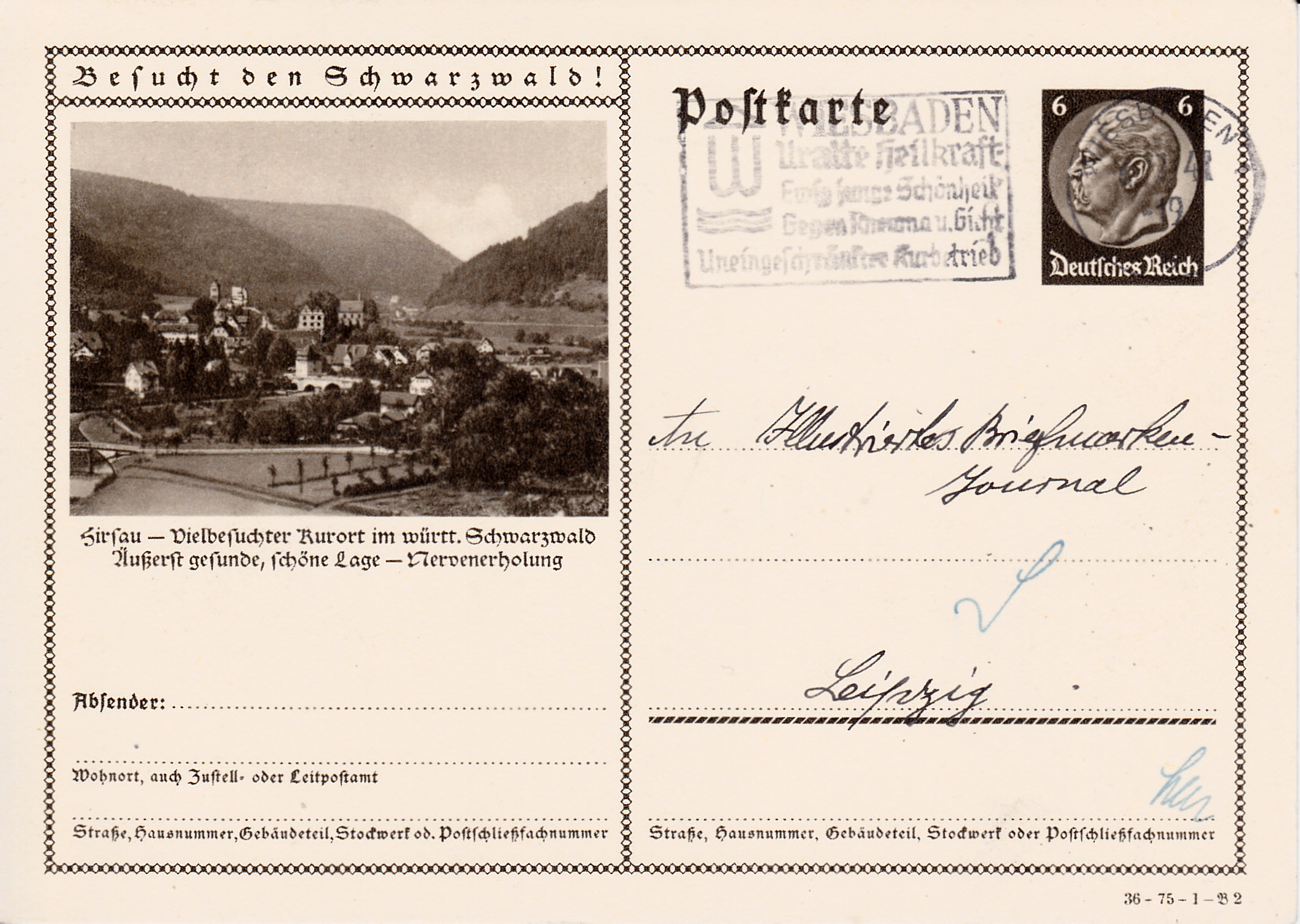Auf dieser Karte (Serie 75 Bild 4) wirbt ein Luftbild für den Kurort Bad Liebenzell im Schwarzwald.