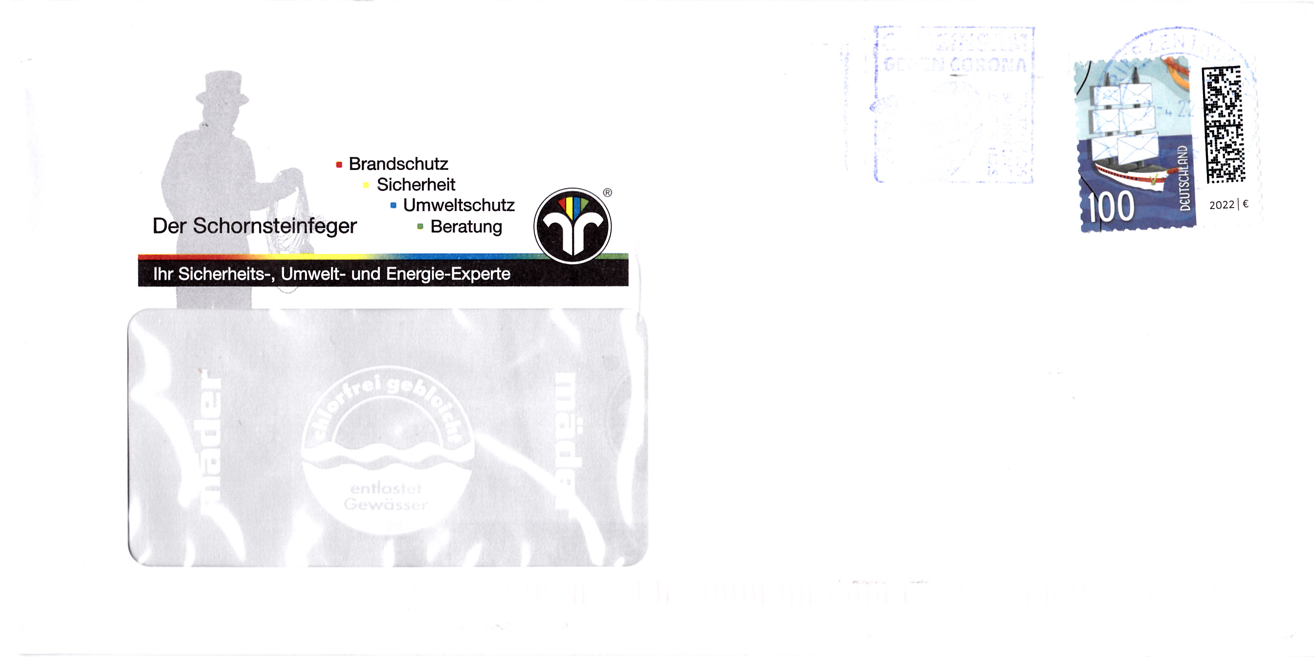 Ein Brief von 21 bis 50g im Standardformat kostet vom 1.1.2022 bis zum 31.12.2024 100 Cent. Dieser Brief wurde am 12.04.2022 im Briefzentrum 54 gestempelt und nach Trier verschickt. Er ist portogerecht mit einer Marke zu 100 Cent frankiert.
