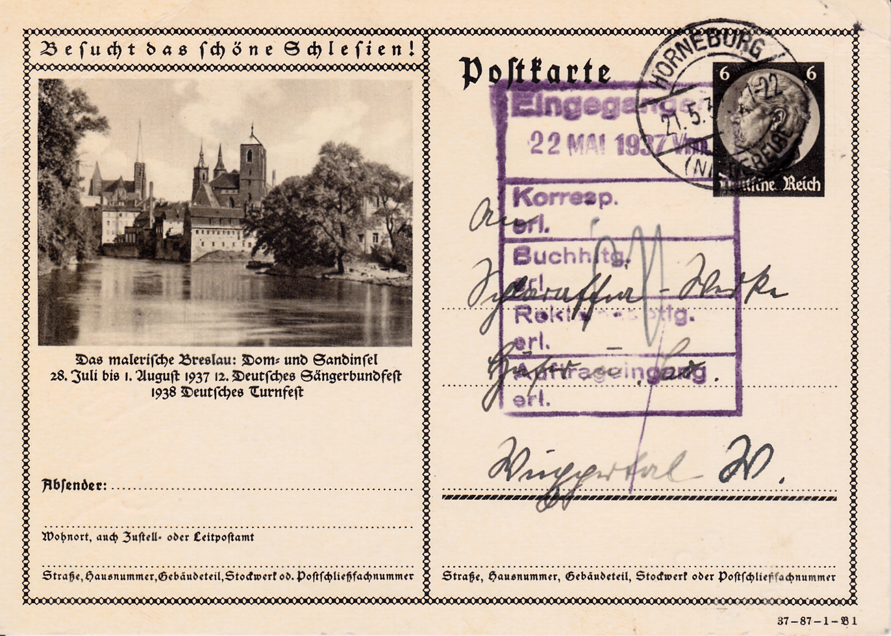 Mit einer Ansicht der Dom- und Sandinsel wirbt Breslau auf dieser Karte (Serie 87 Bild 1) für das 12. Deutsche Sängerbundfest 1937 und das Deutsche Turnfest 1938, die beide in Breslau stattfanden.
