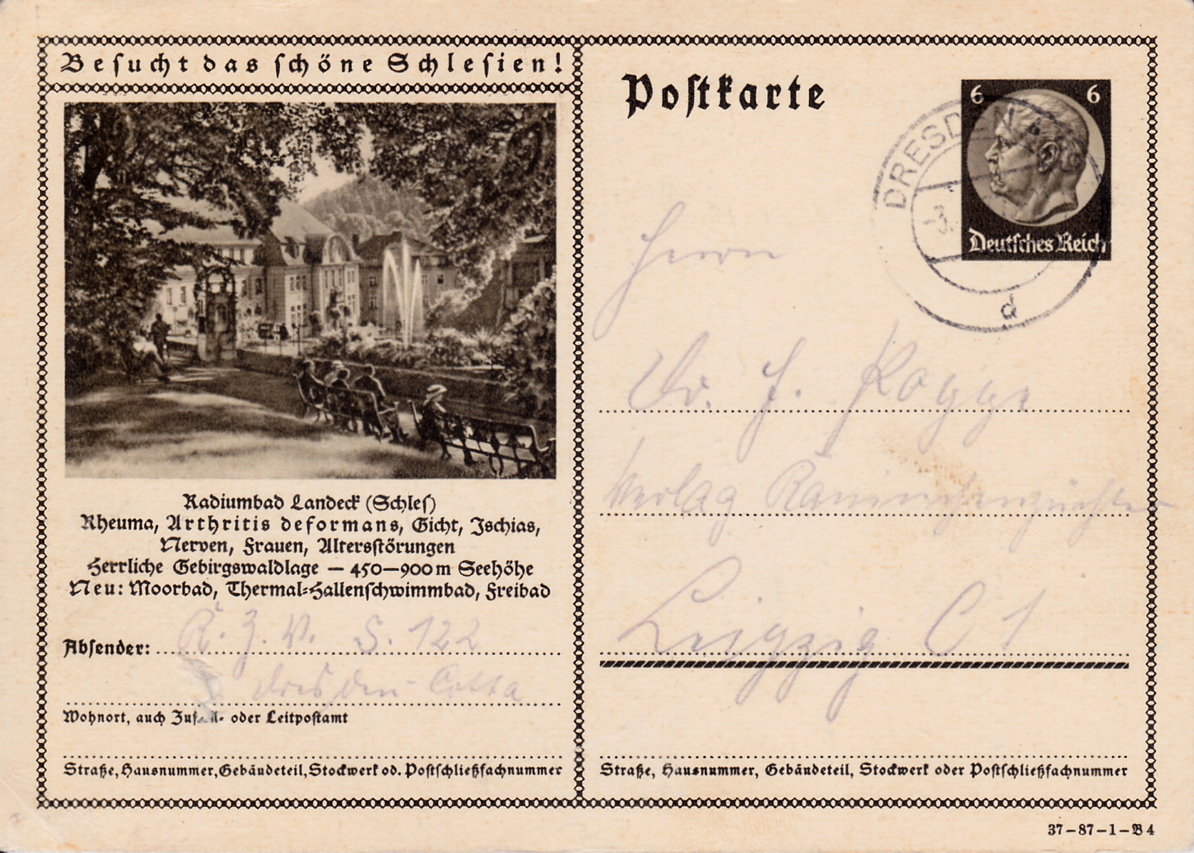 Auch mit der Breslauer Jahrhunderthalle wirbt Breslau auf dieser Karte (Serie 87 Bild 7) für das 12. Deutsche Sängerbundfest 1937 und das Deutsche Turnfest 1938, die beide in Breslau stattfanden. Die Karte ist in Breslau mit einem Sonderstempel gestempelt worden.