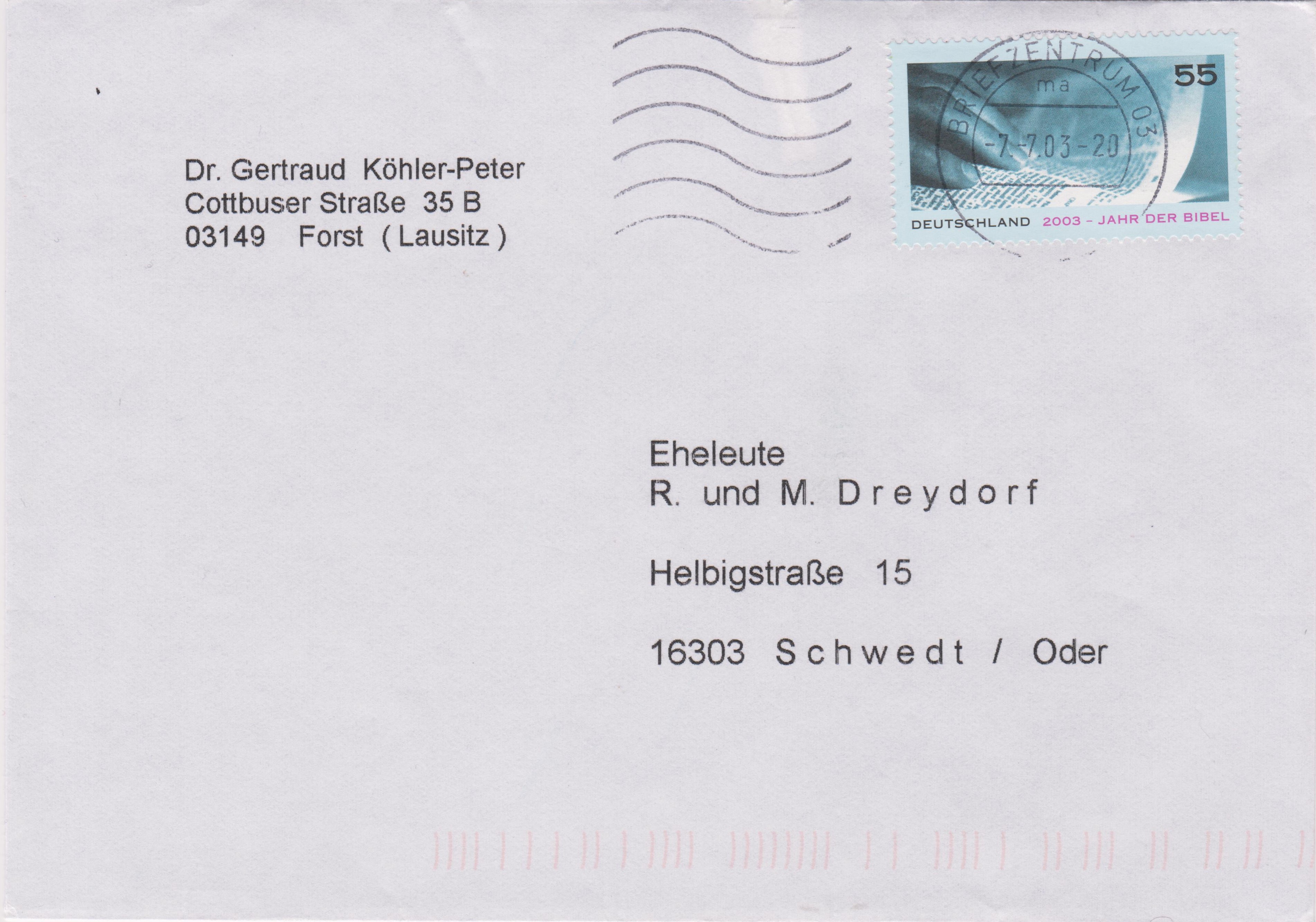 Aktuell wurde dort am 12.08.2013 dieser Maschinenstempel mit Kennbuchstabe "ma" sowie Werbeeinsatz "Briefzentrum 03 Cottbus" eingesetzt: