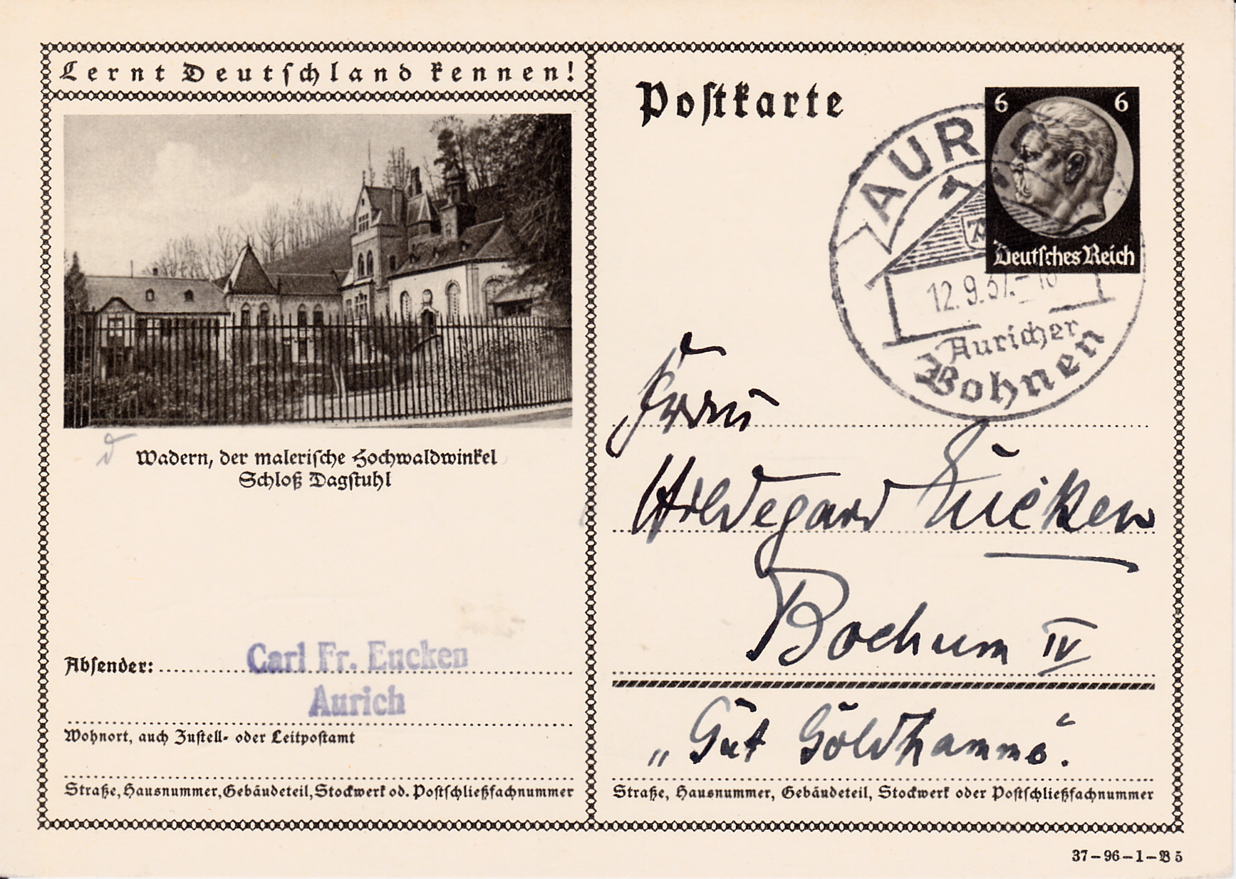 Wadern, eine Stadt im Saarland, zeigt auf dieser Karte (Serie 96 Bild 5) ein Foto mit dem Schloss Dagstuhl. Es wurde 1760 von Graf Anton von Öttingen-Soetern-Hohenbaldern am Fuß der alten Dagstuhler Burg erbaut.