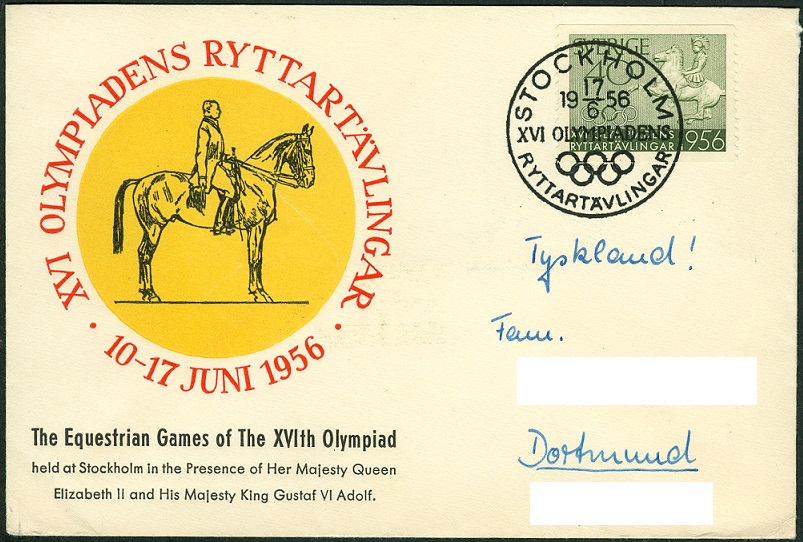 Die wegen der Quarantänebedingungen Australiens vergebenen "Reiterspiele", die olympischen Reitdisziplinen, fanden vom 10. - 17. Juni 1956 im schwedischen Stockholm statt.