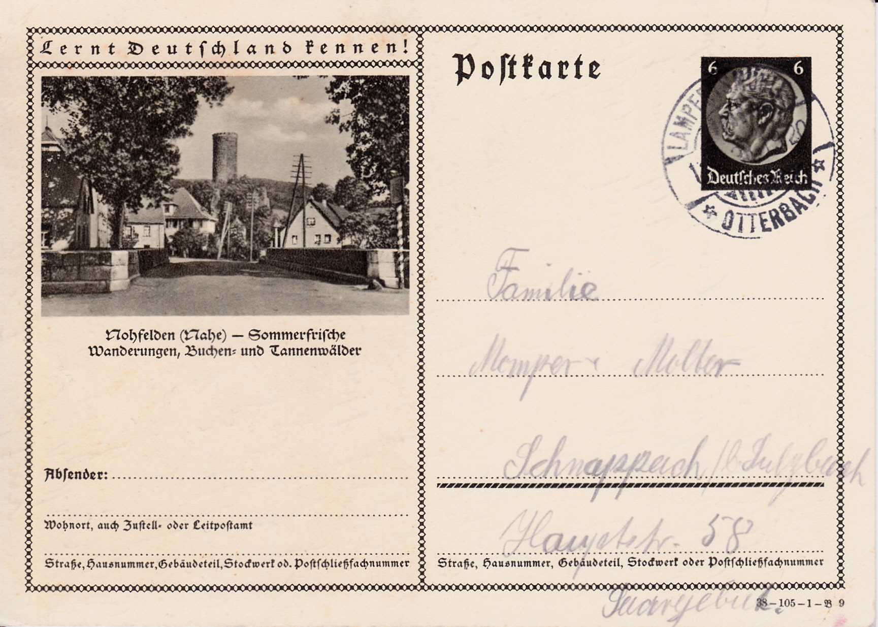 Auf dem Foto von Nohfelden (Nahe) dieser Karte (Serie 105 Bild 9) ist auch der Burgturm der Burg Veldenz, die auch Burg Nohfelden genannt wird, zu sehen.