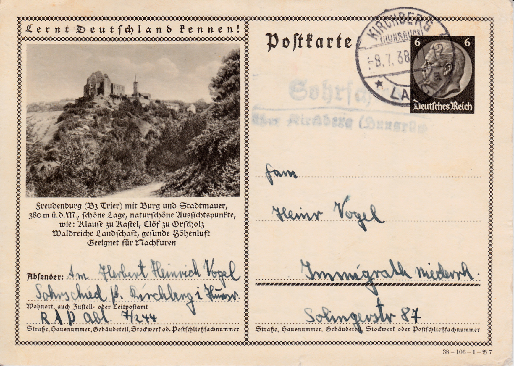 Freudenburg im Bezirk Trier zeigt auf dieser Karte (Serie 106 Bild 7) die Burgruine Freudenburg.