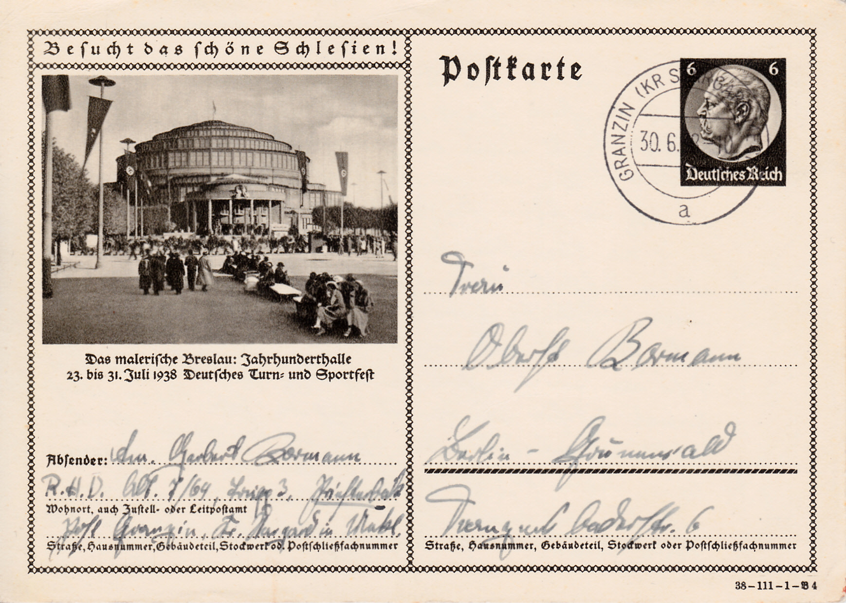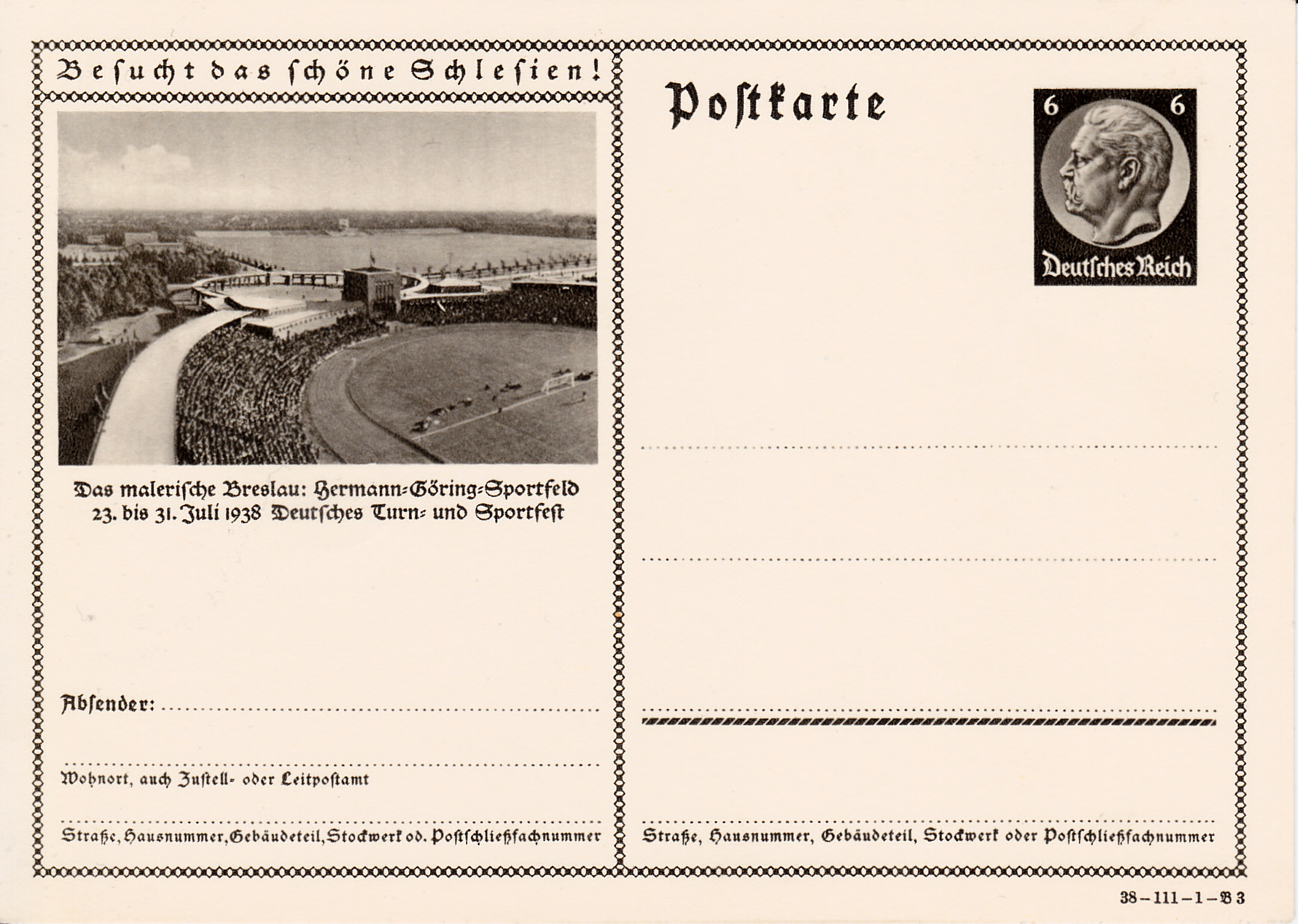 Auch auf dieser Karte (Serie 111 Bild 3) mit der Abbildung des Olympiastadion in Breslau (polnisch: Stadion Olimpijski we Wrocławiu), ehemals Schlesierkampfbahn im Sportpark Leerbeutel, ehemals auch Hermann-Göring-Stadion) wird für das Deutsche Turnfest 1938 geworben.