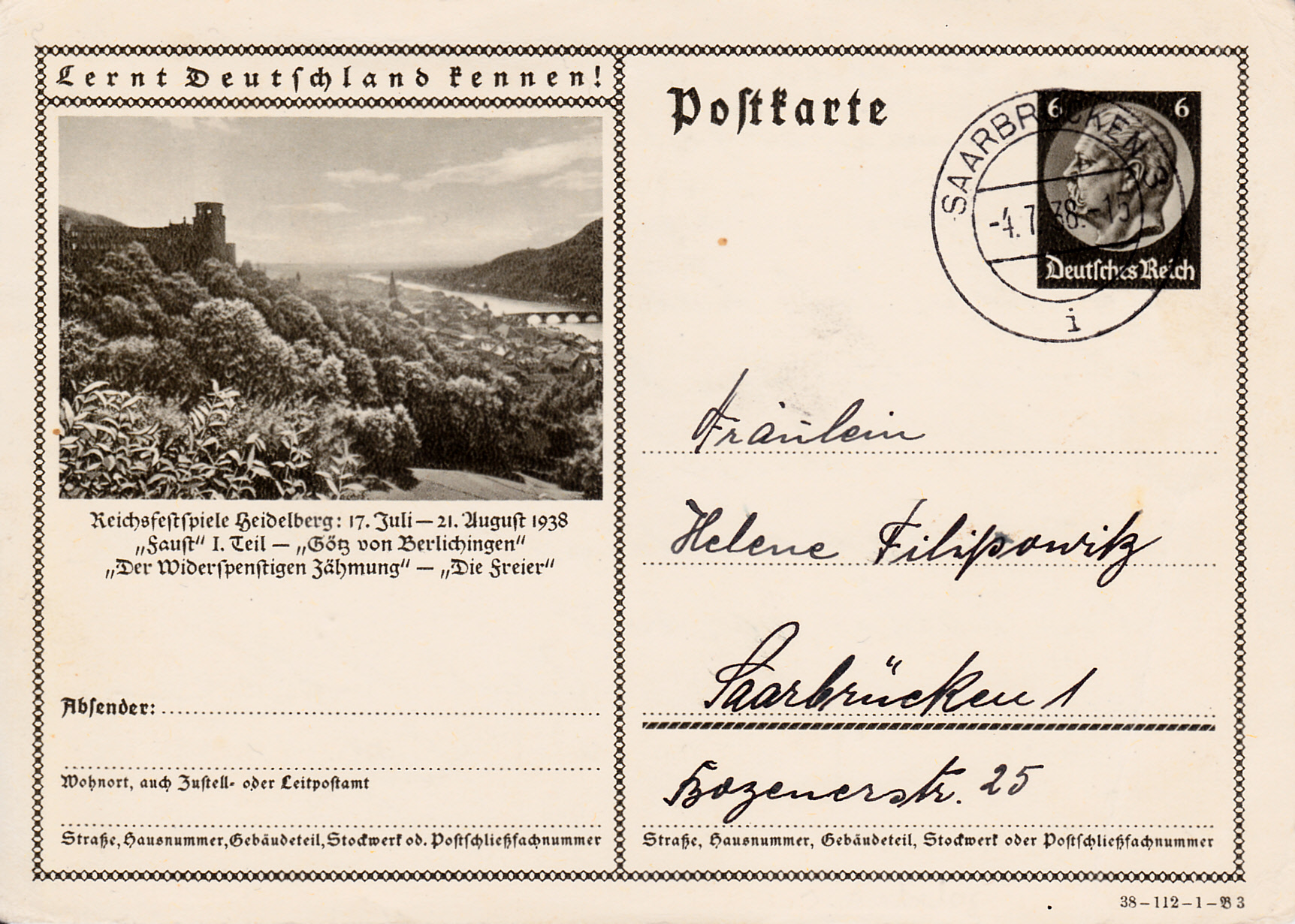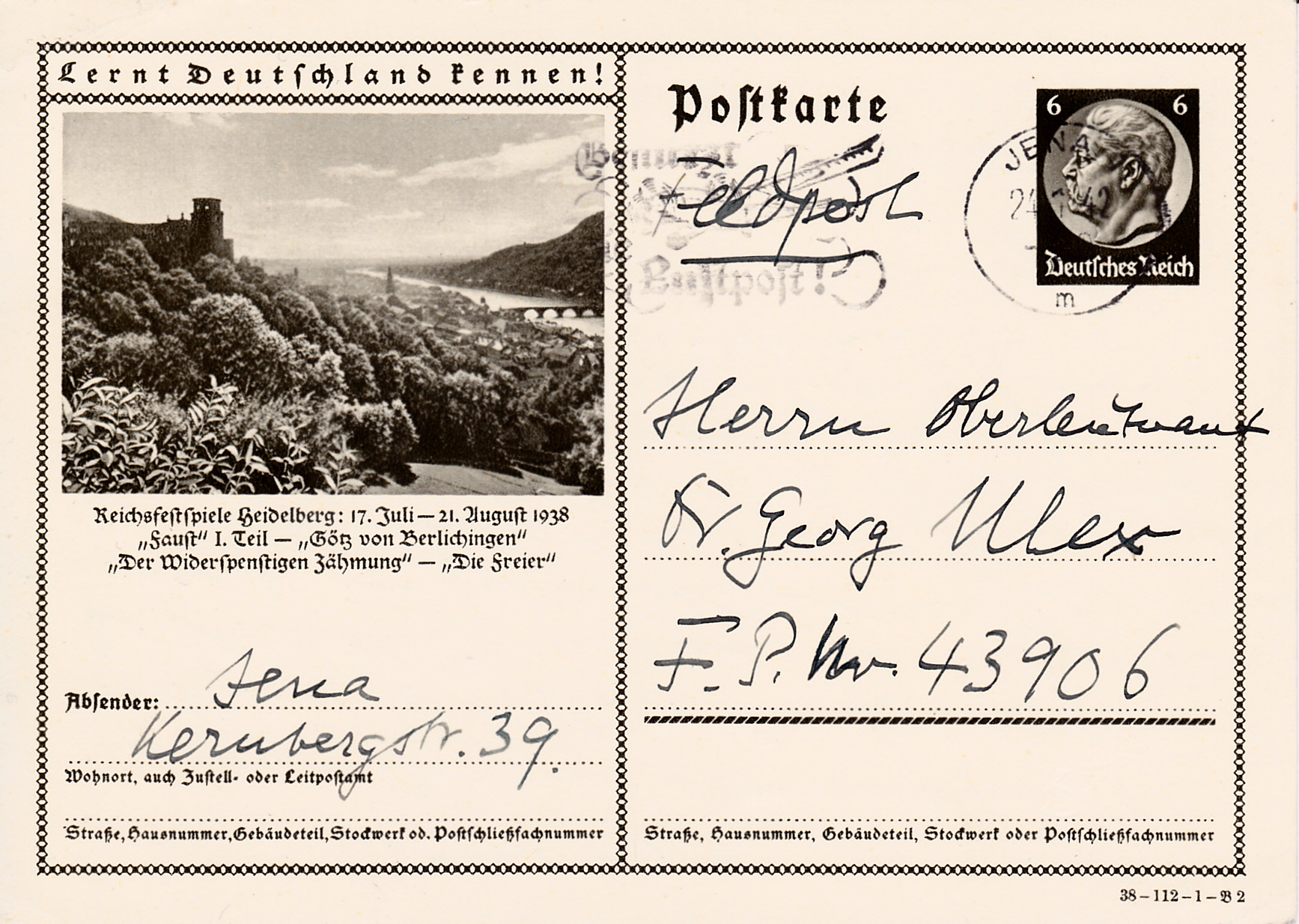 Heidelberg zeigt auf den Karten 1938 das gleiche Foto mit dem Heidelberger Schloss wie auf der Karte 1936. Hier zeige ich die Karte mit dem Druckvermerk "1938-112-1-B2" also Serie 112 Bild 2. Es werden auch die Aufführungen bei den Reichsfestspiele Heidelberg beworben.