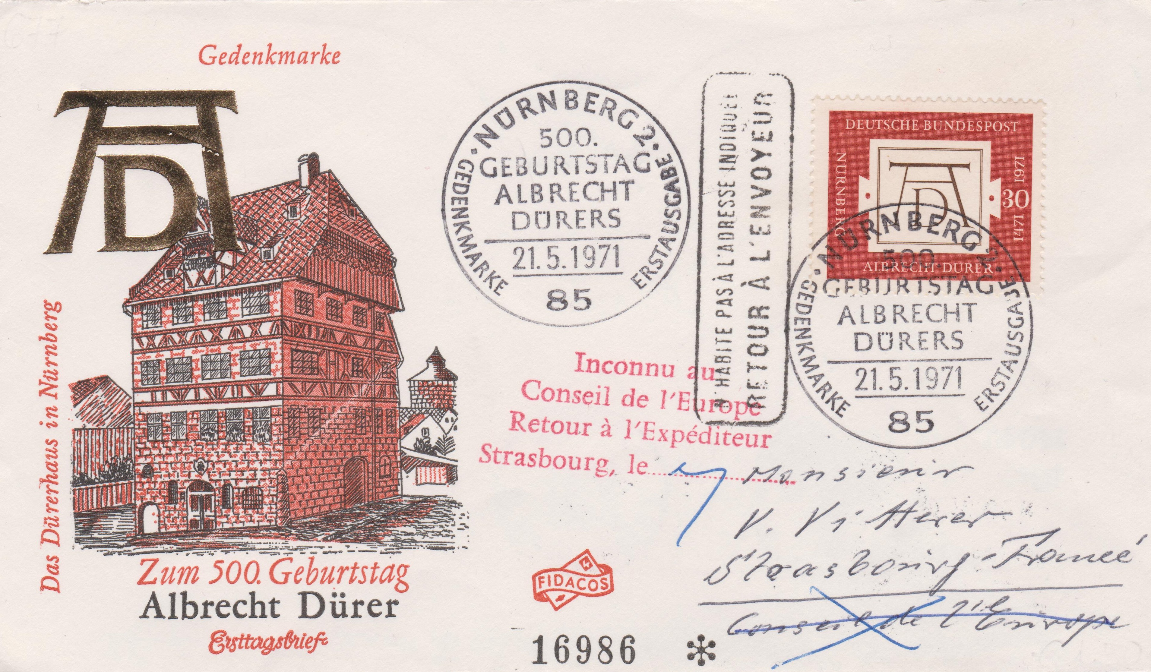 Zum 500. Geburtstag von Albrecht Dürer erschien am 21.05.1971 bei der Deutschen Bundespost ein Postwertzeichen, MiNr. 677, mit Signum "AD" von A. Dürer. Hier ein echt gelaufenen Ersttagsbrief mit dem Ersttagssonderstempel NÜRNBERG 2: