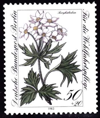Das schon hier beschriebene Narzissen-Windröschen (Anemone narcissiflora) oder Alpen-Berghähnlein ist auch auf dieser Marke aus Berlin (MiNr 703) abgebildet.