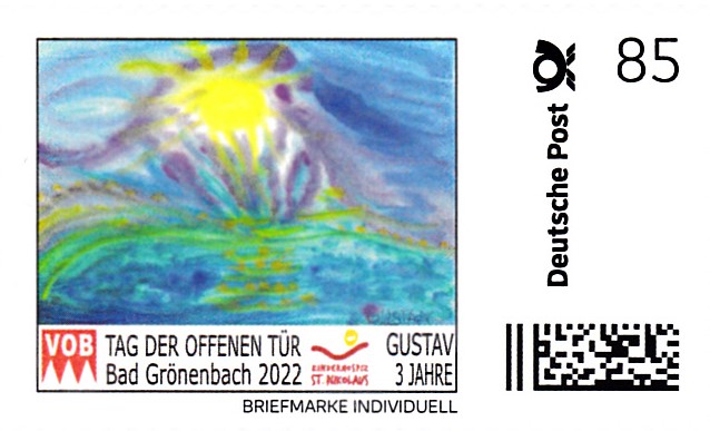 Auch im Jahre 2022 gibt es Marken Individuell für eine Spendenaktion für das Kinderhospiz in Bad Grönenbach. Sie zeigen wieder Bilder aus der Maltherapie. Zu dieser Marke hat ein Gustav (3 Jahre) das Motiv (vermutlich mit Hilfe) "entworfen".