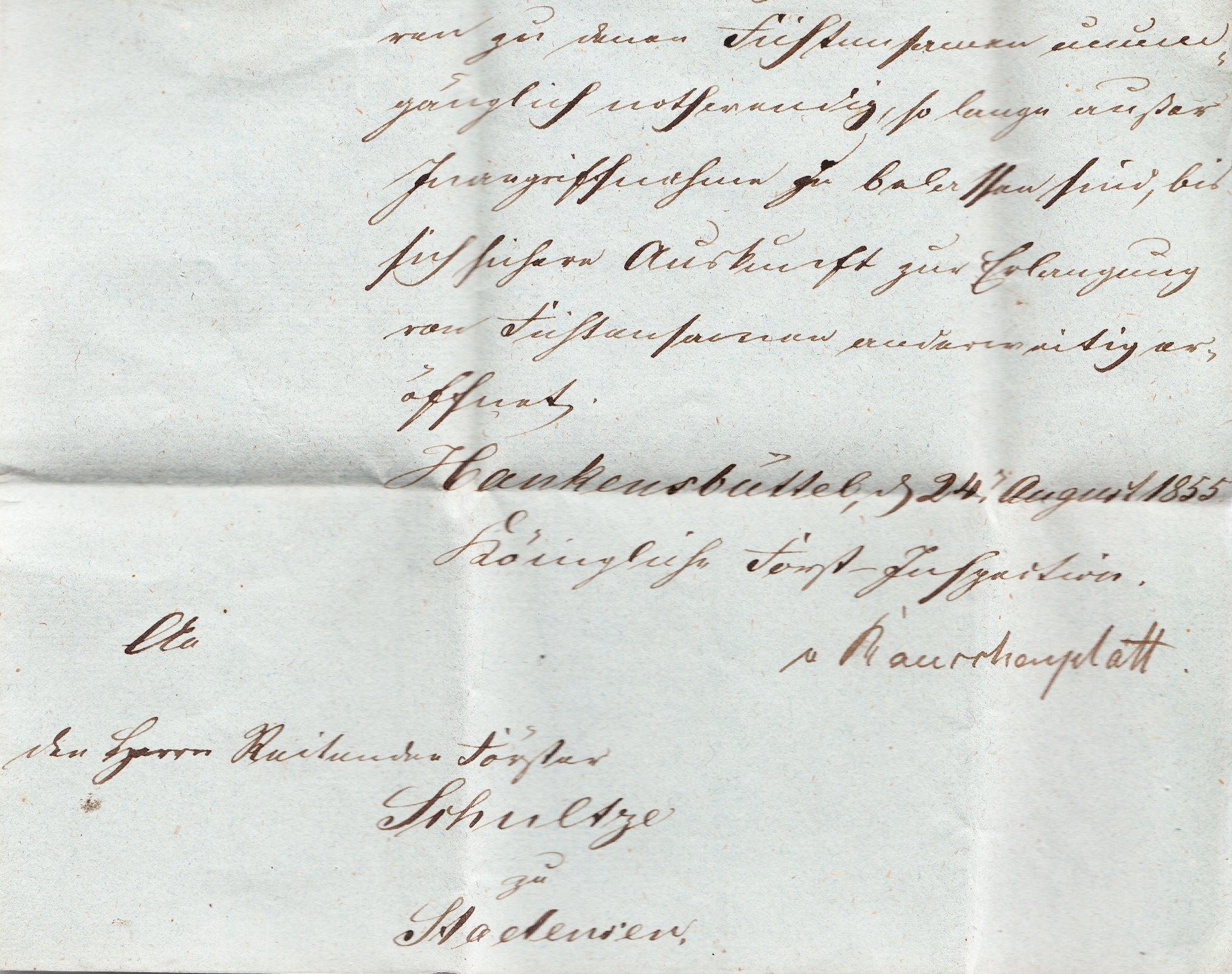 Dieser am 24.08.1855 von der "Königlichen Forst-Inspection Hankensbüttel" geschriebene Brief wurde am 24.08.1855 in WITTINGEN aufgegeben und erhielt dort den üblichen Zweikreisstempel in Antiquaschrift in Blau: