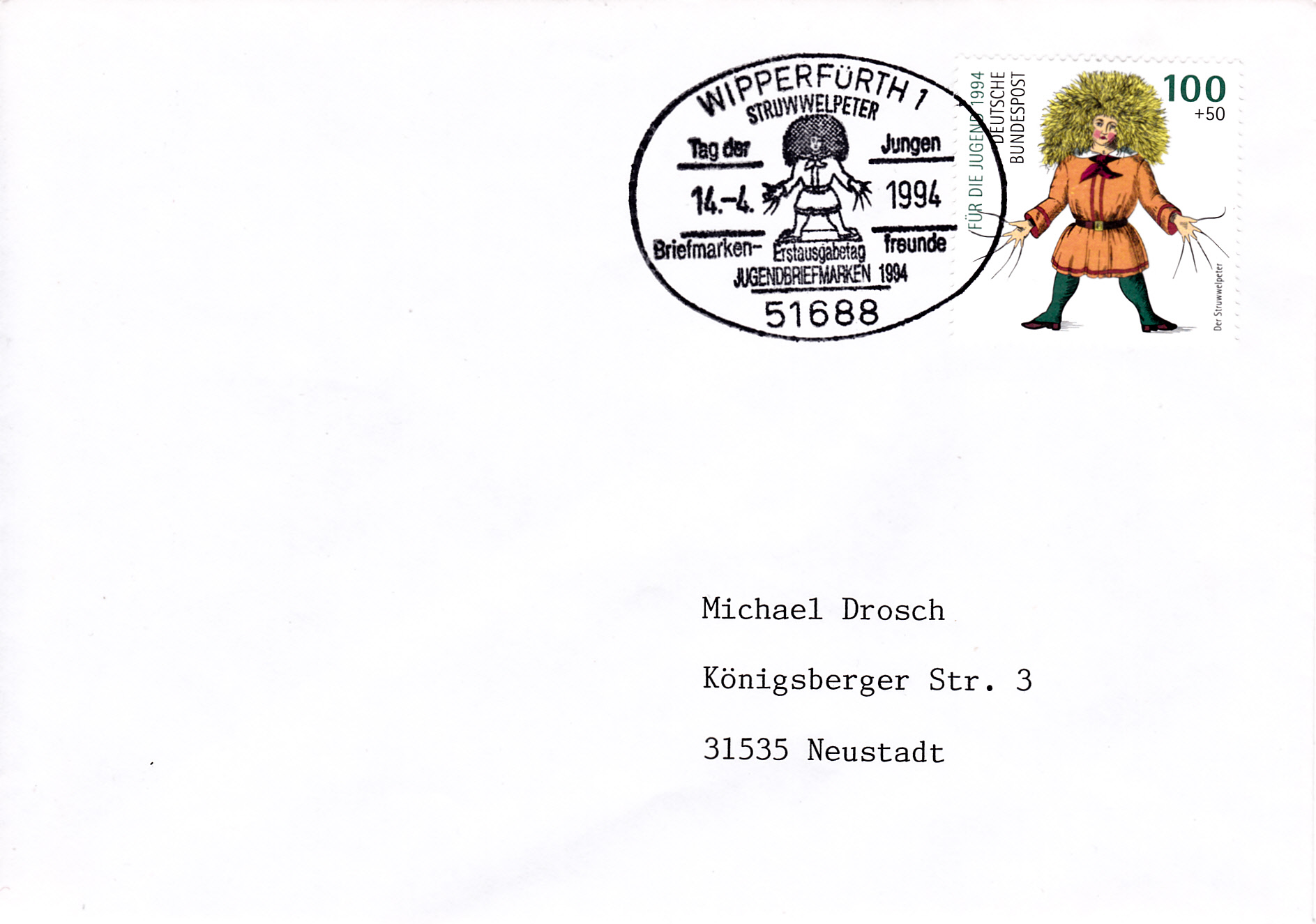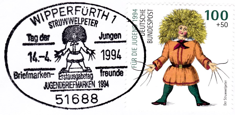 Der Sonderstempel aus Grossrosseln (Ortsteil St. Nikolaus) zur Briefmarkenausstellung am Nikolaustag 1994 zeigt die Illustration zu den Versen: