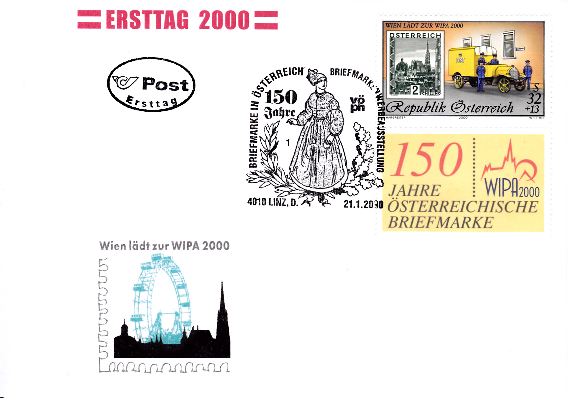 FDC mit der hier bereits gezeigten Marke (MiNr 2270 II) aus dem Block zur Internationalen Briefmarkenausstellung WIPA 2000 in Wien mit der Jahreszahl "2000" mit anhängendem Zierfeld aus dem Block und einem passenden Sonderstempel aus Linz mit der Kennziffer "1".
