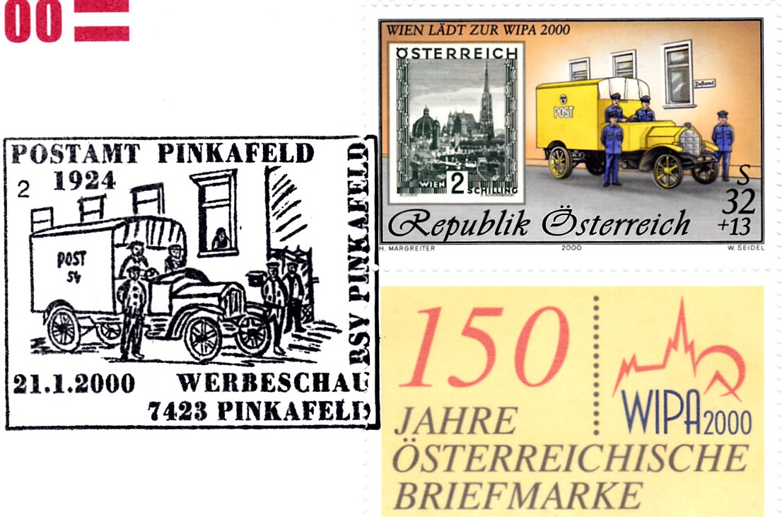 FDC mit der hier bereits gezeigten Marke (MiNr 2270 II) aus dem Block zur Internationalen Briefmarkenausstellung WIPA 2000 in Wien mit der Jahreszahl "2000" mit anhängendem Zierfeld aus dem Block und einem passenden Sonderstempel aus Pinkafeld mit der Kennziffer "2".