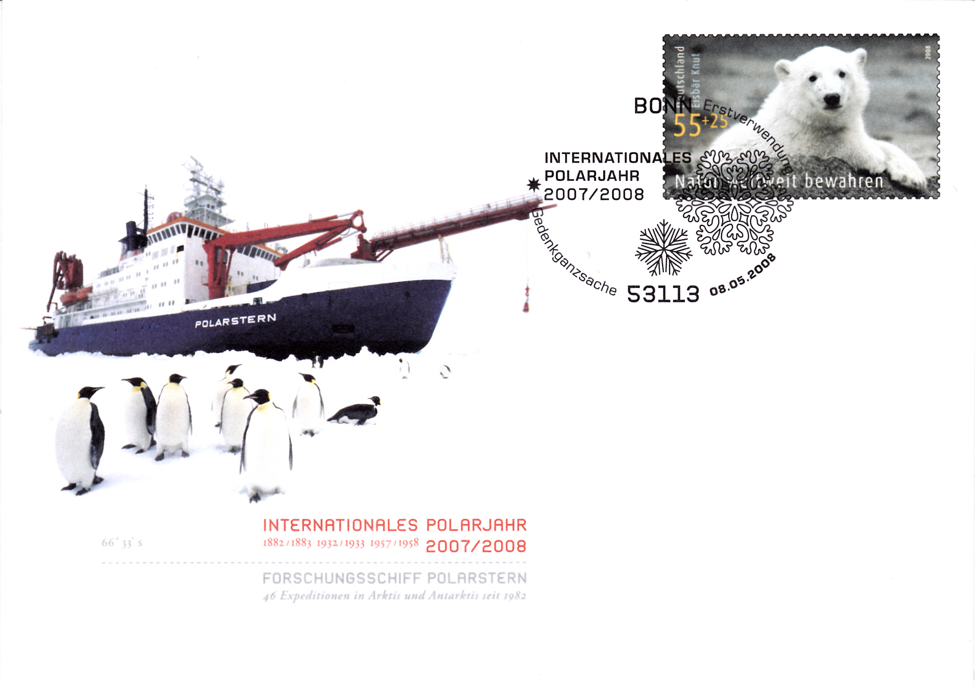 Im Zudruck der Gedenkganzsache zum "Internationalen Polarjahr 2007/2008" (MiNr USo 154) ist eine Gruppe mit Kaiserpinguinen (Aptenodytes forsteri) vor dem Forschungsschiff "Polarstern" zu sehen.