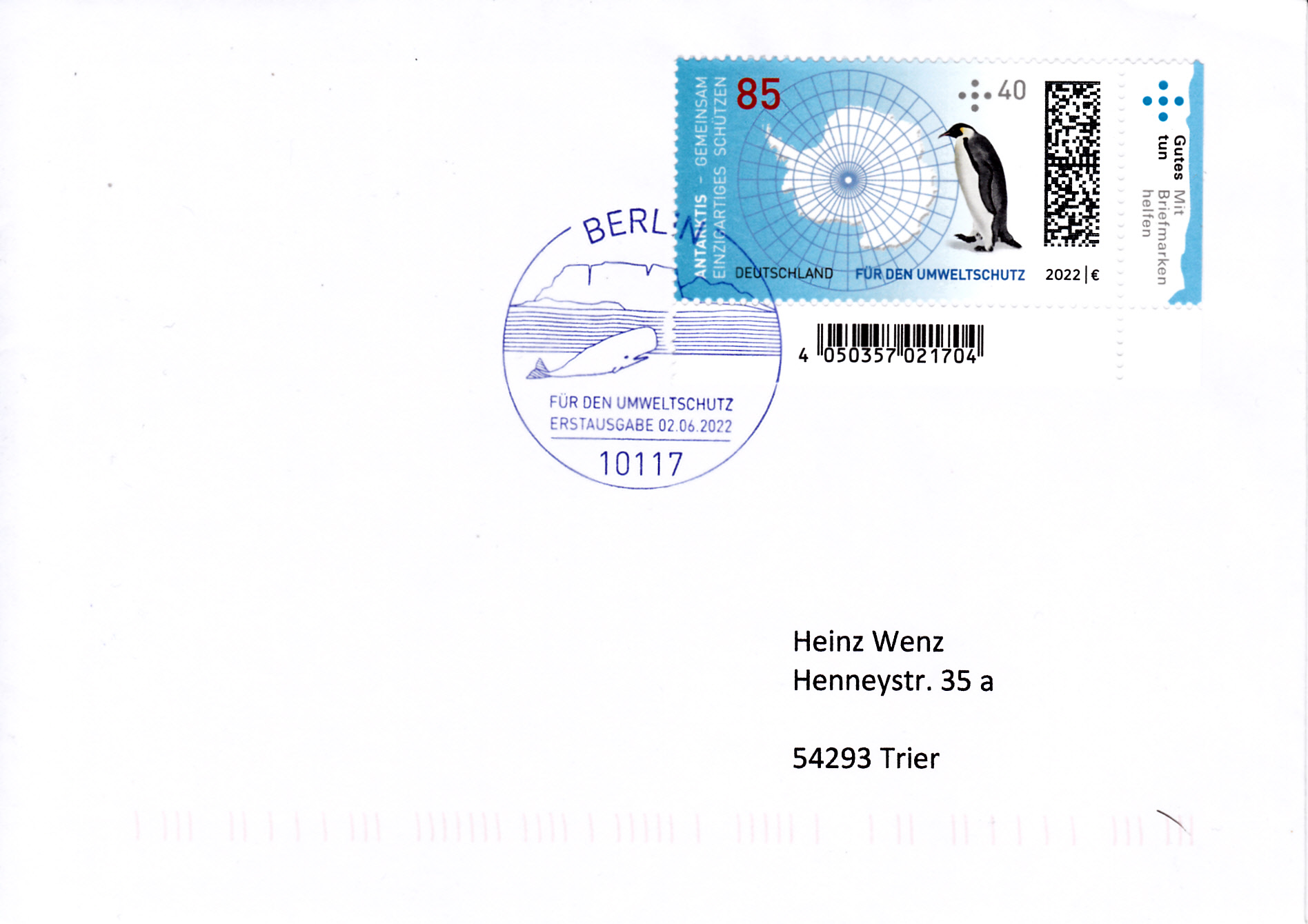 Die Marke "Umweltschutz" 2022 der Deutschen Post steht (MiNr 3689) unter dem Motto "Schutz der Arktis" und bildet eine Karte der Antarktis und einen Kaiserpinguin (Aptenodytes forsteri) ab. Ich zeige hier ein Eckrandstück mit EAN-Codierung.