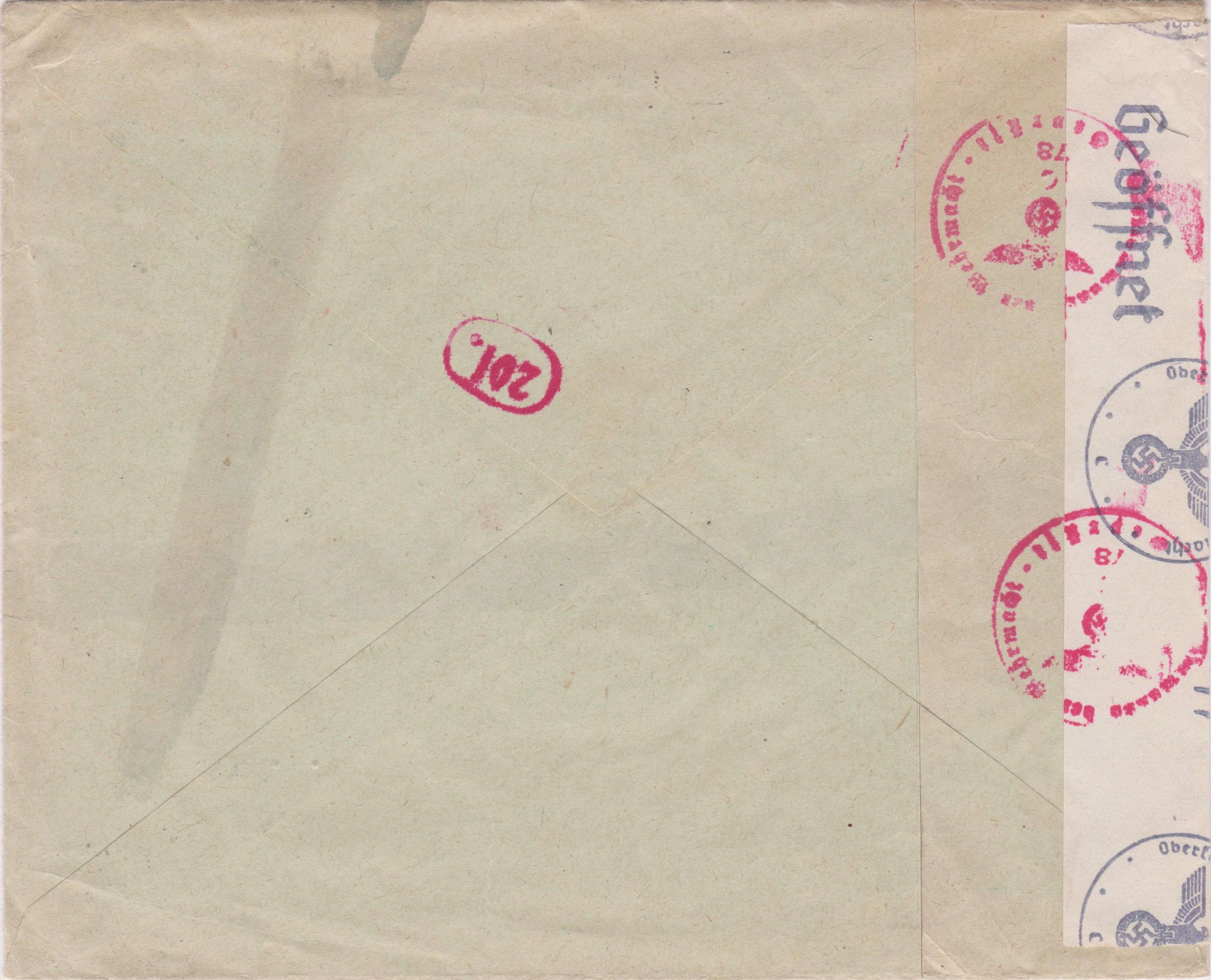 Rückseitig erfolgte eine chemische Zensur mit zwei verschiedenen Chemikalien durch waagerechte Pinselstriche.
