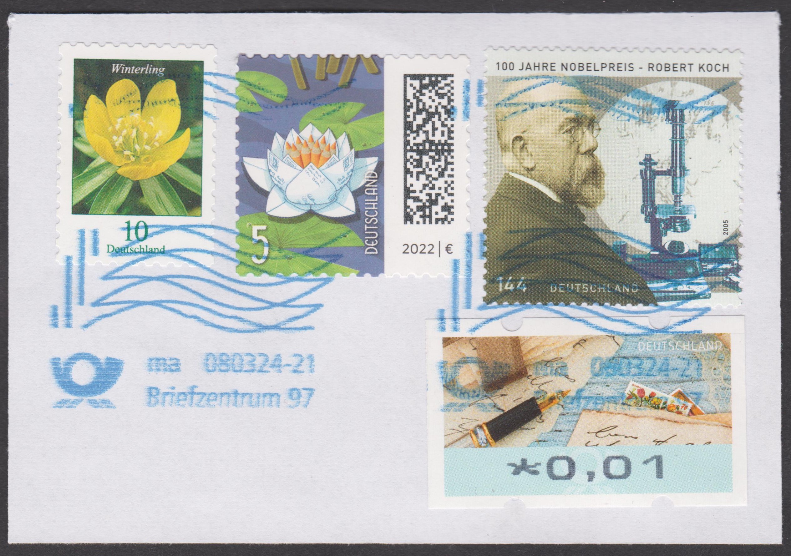 Zum 100. Jahrestag der Verleihung des Nobelpreises an Robert Koch ist bei der Deutschen Post diese Sondermarke (MiNr 2496) mit einem Porträt von Robert Koch und einem Mikroskop.