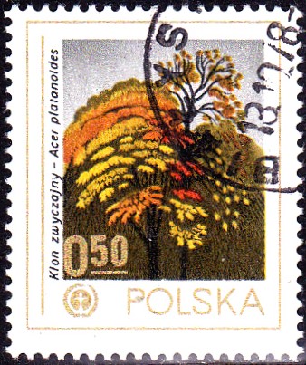 Aus Polen kommt diese Marke (MiNr 2569) mit einem Spitzahorn (Acer platanoides).