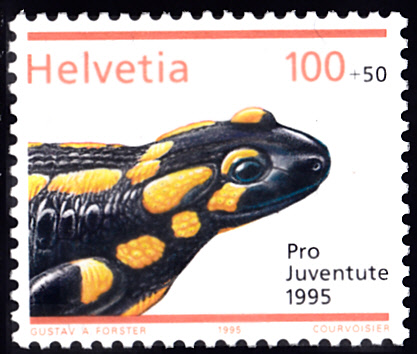 Auch auf dieser Marke aus der Schweiz (MiNr 1570) wird ein Feuersalamander (Salamandra salamandra) gezeigt.