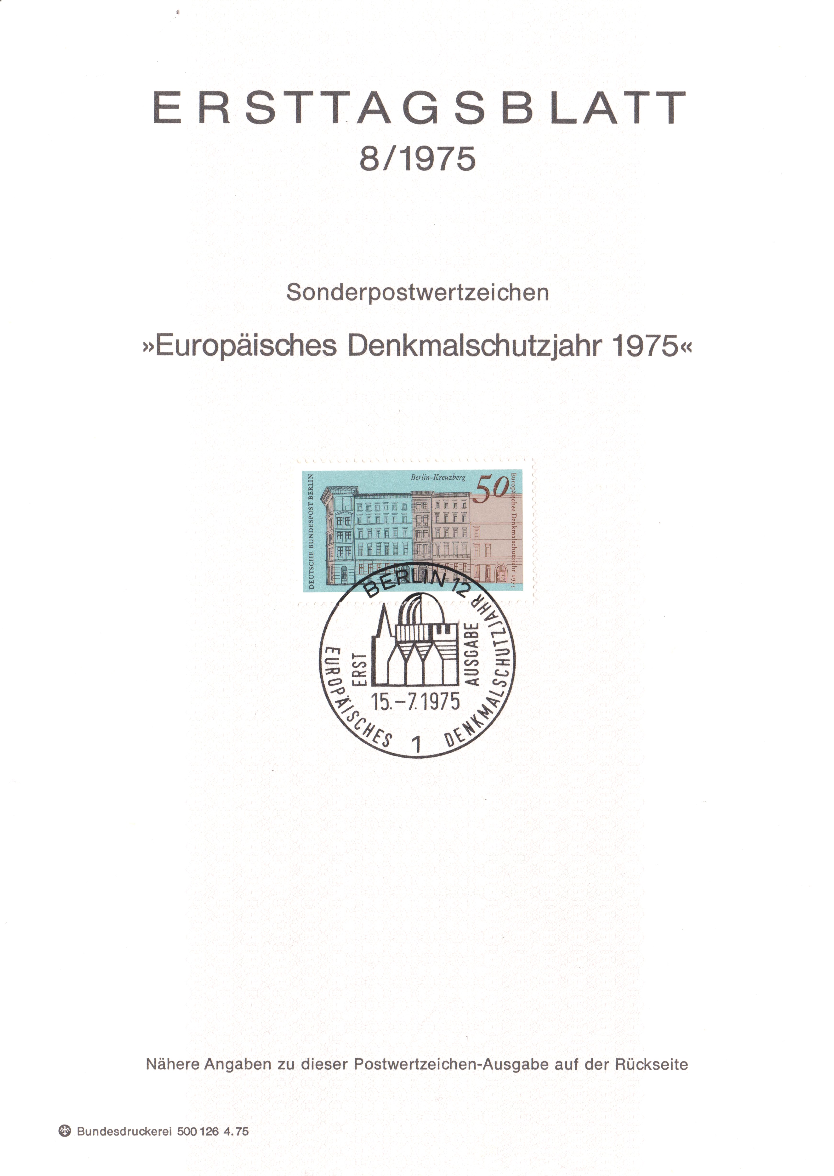 Deutsche Bundespost Berlin, ERSTTAGSBLATT 8/1975 mit Sonderpostwertzeichen "Europäisches Denkmalschutzjahr 1975":