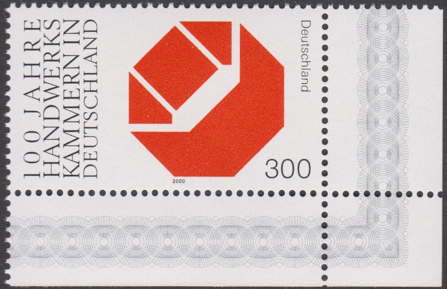 BUND MiNr. 2124 erschien am 08.06.2000 aus Anlass "100 Jahre Handwerkskammern in Deutschland", hier ein Exemplar vom rechten Bogenrand des Zehnerbogens mit Vollstempel "59872 MESCHEDE" vom 08.06.2000, dem Tag der Ausgabe dieses Postwertzeichens: