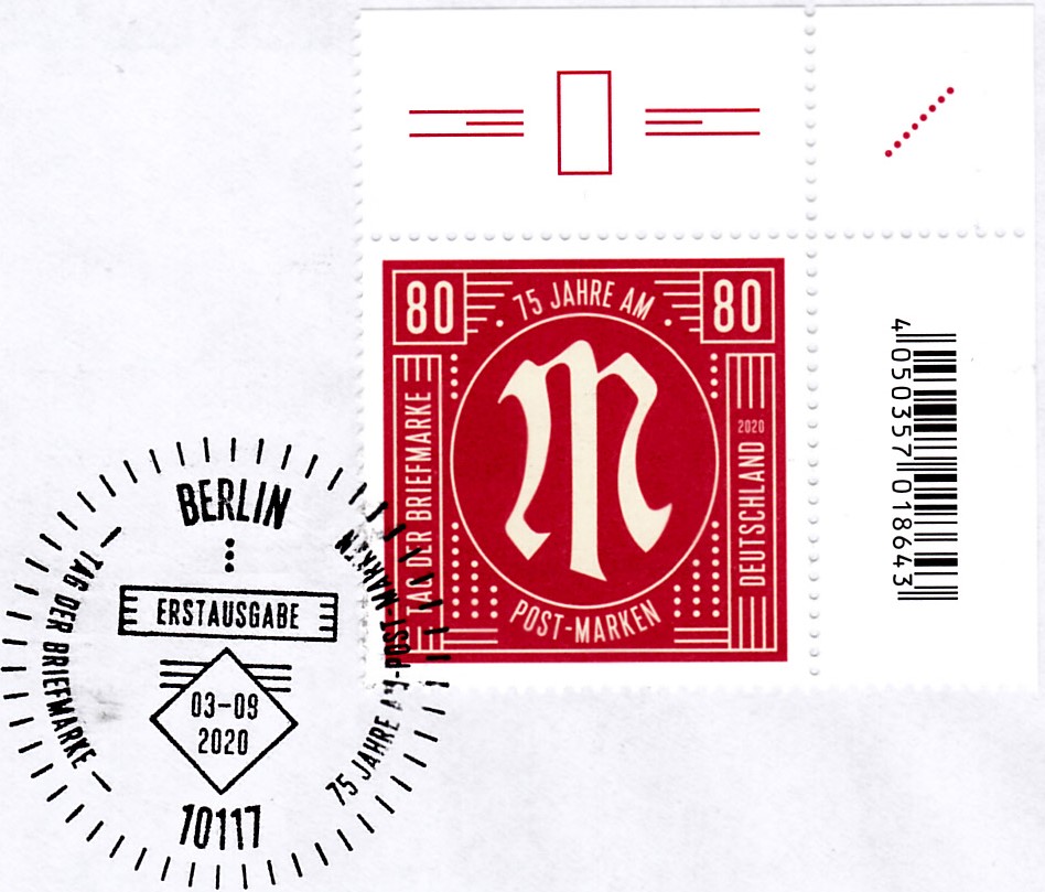 Bei der Deutschen Post ist zum Tag der Briefmarke 2020 eine Marke zu 80 Cent erschienen. Sie zeigt zum Jubiläum 75 Jahre AM-Post-Marken eine "Neuinterpretation des AM-POST-Markendesigns". Hier zeige ich ein Eckrandstück mit EAN-Codierung.