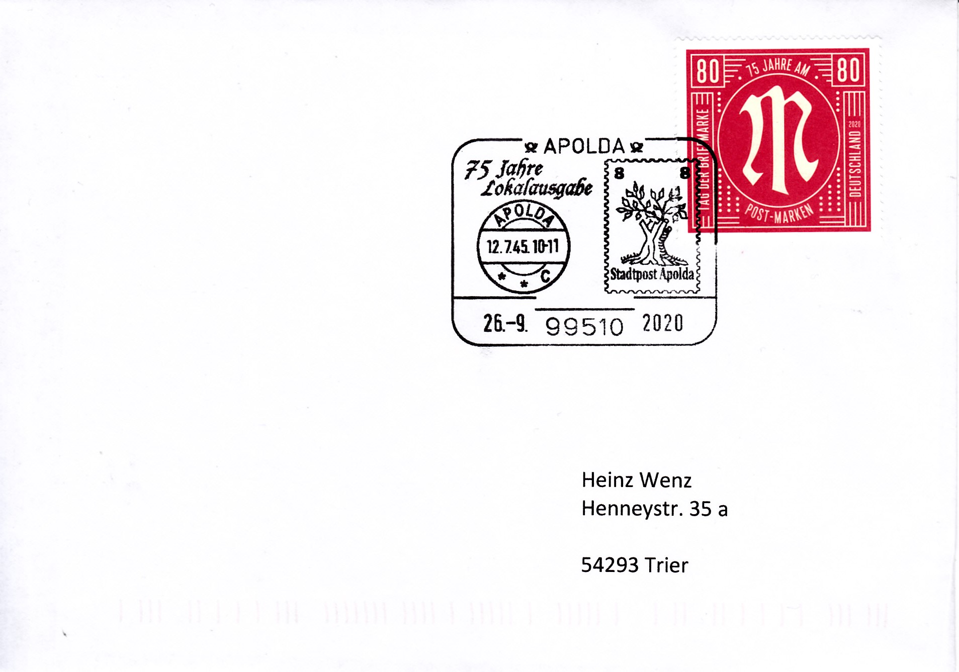Auf diesem Brief wurde die Marke zum Tag der Briefmarke mit einem Sonderstempel vom 26.09.2020 aus Apolda gestempelt. Der Stempel zeigt die Marke zu 8Pf der Deutschen Lokalausgaben aus Apolda (MiNr 3).