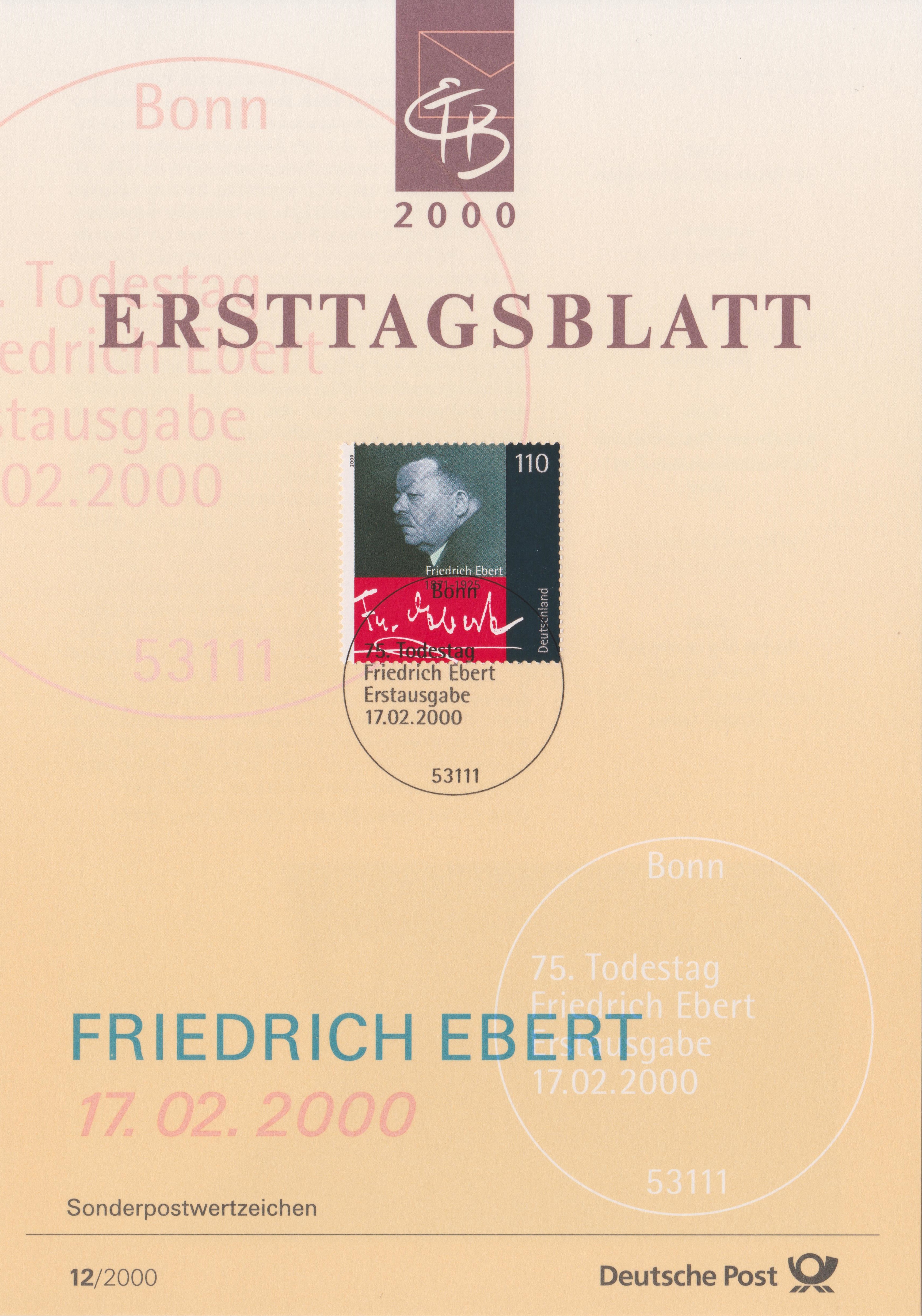 BUND MiNr. 2101 erschien am 17.02.2000 zum 75. Todestag von Friedrich Ebert, hier auf ETB 12/2000: