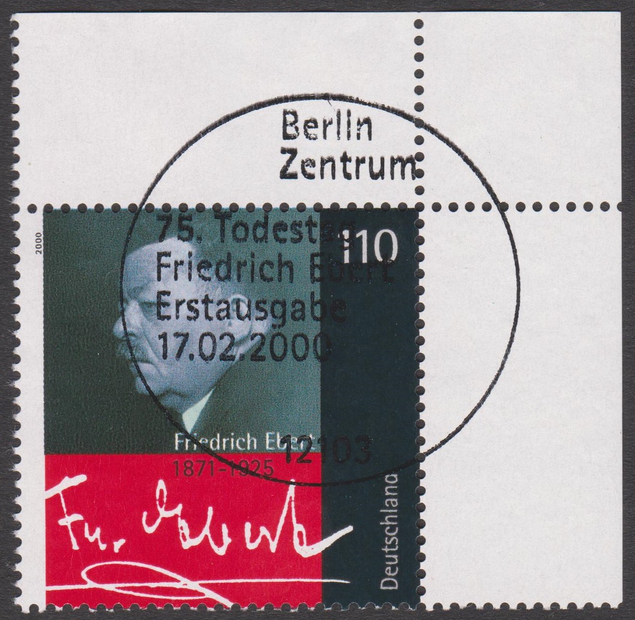 BUND MiNr. 2101 erschien am 17.02.2000 zum 75. Todestag von Friedrich Ebert, hier Bogenecken oben rechts (= Feld 5) sowie unten rechts (= Feld 10) mit ESST Berlin: