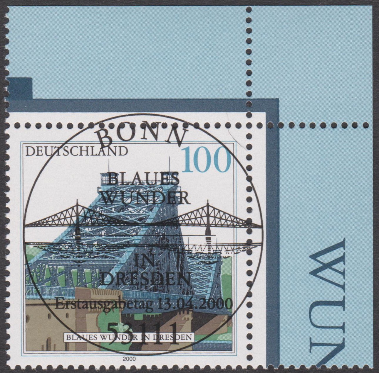 "Blaues Wunder" in Dresden, Bund MiNr. 2109, Eckrand oben rechts mit ESST BONN: