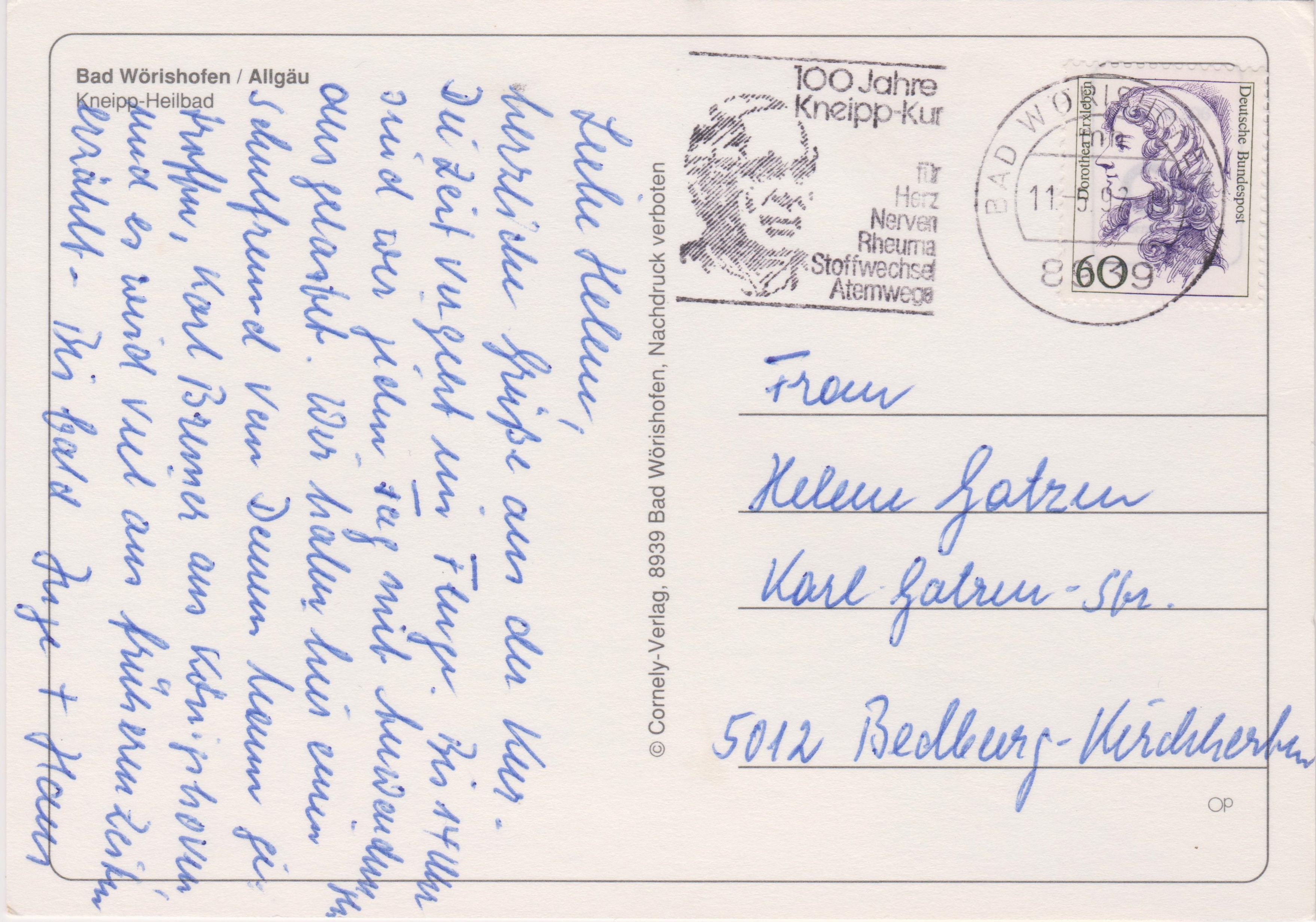 Gelaufener FDC von Wien nach Zürich mit einer Marke aus Österreich (MiNr 1700) zum Internationalen Kneipp-Kongress in Wien mit dem Porträt von Sebastian Kneipp. Auch im Ersttagsonderstempel wird ein Porträt von Kneipp gezeigt.
