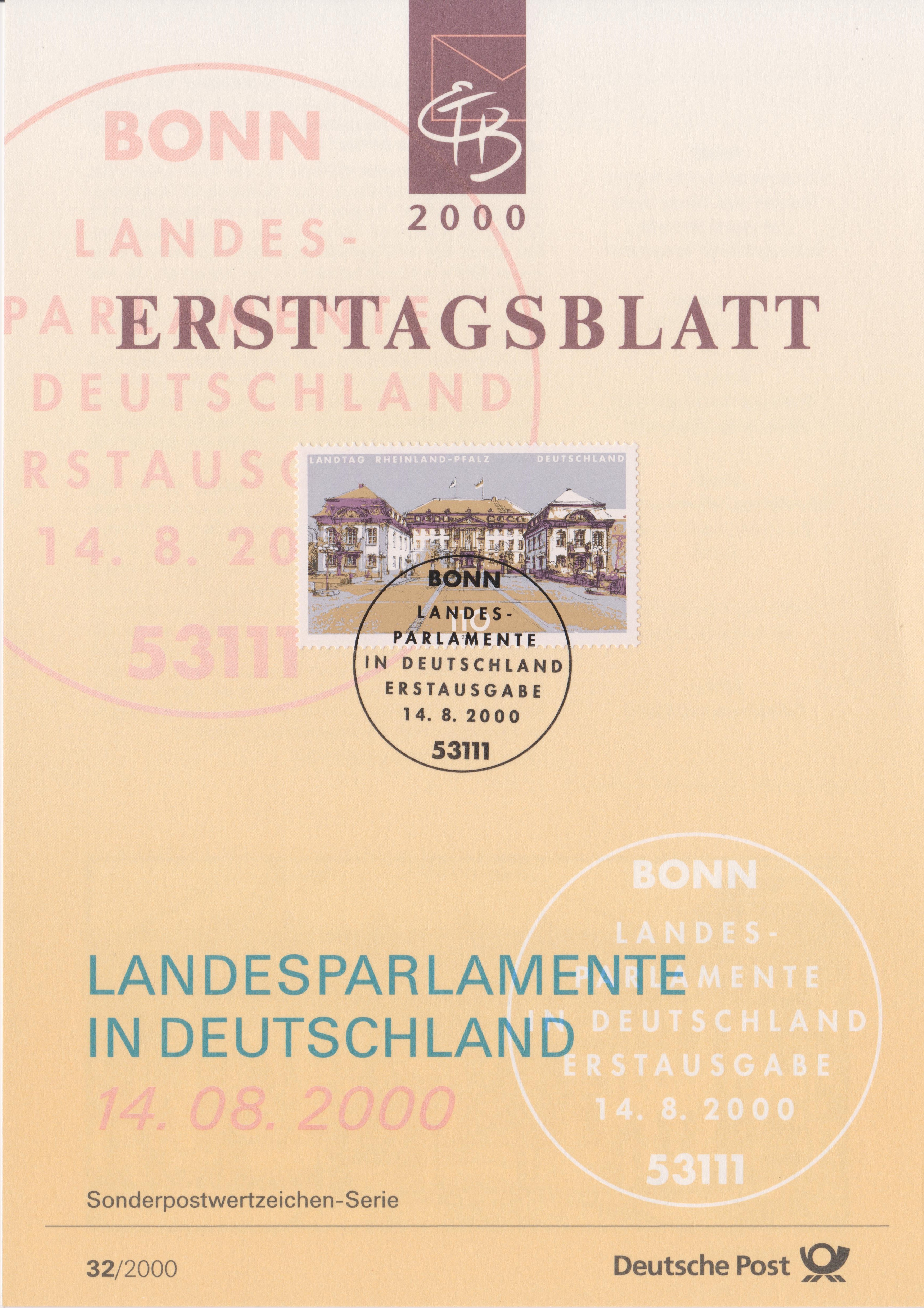 Dieses am 14.08.2000 erschienene Postwertzeichen der Bundesrepublik Deutschland, MiNr. 2129, zeigt das Deutschhaus, hier auf ETB 32/2000: