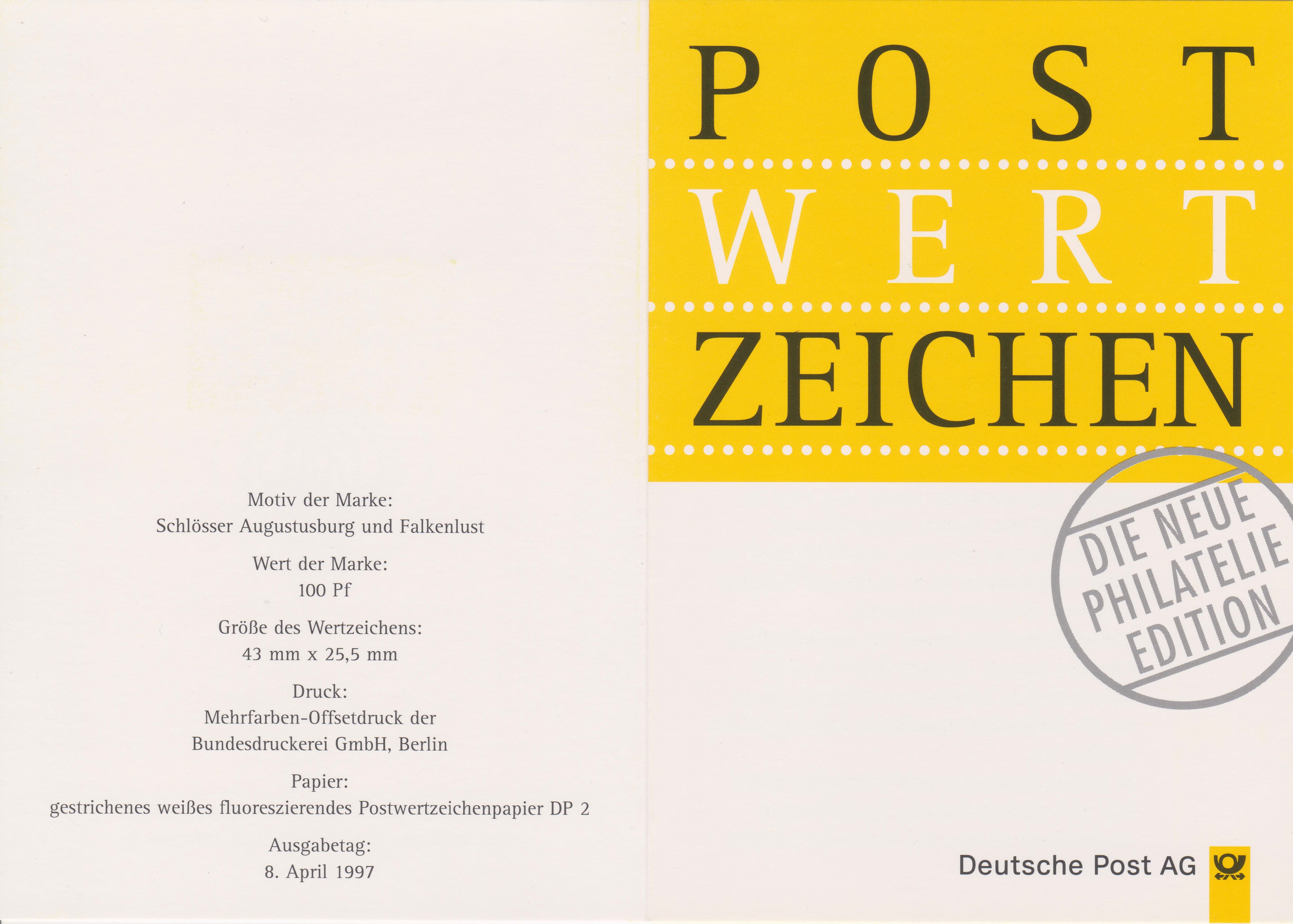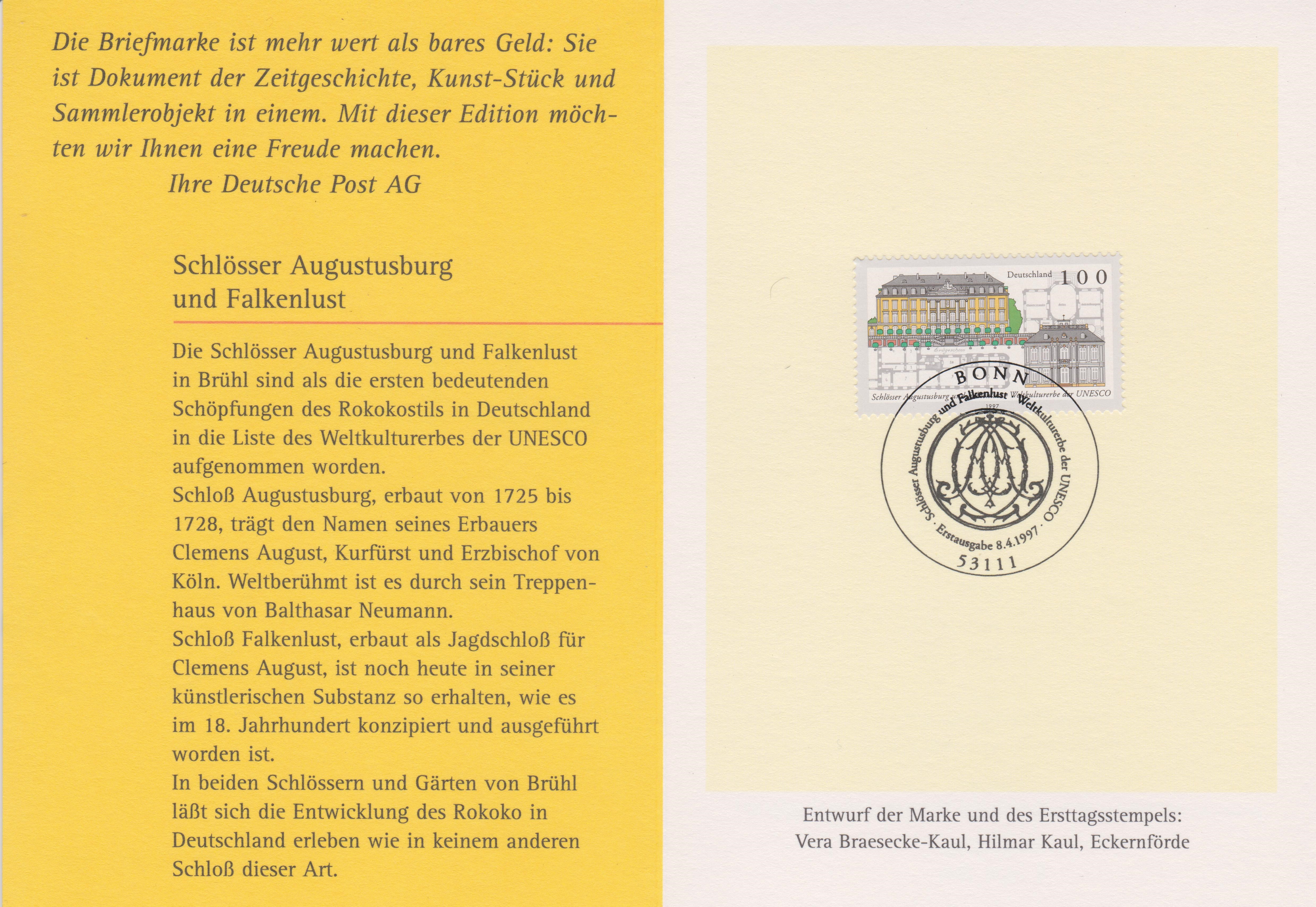 Hier die Klappkarete mit Bund MiNr. 1913 Schlösser Augustusburg und Falkenlust mit ESST BONN vom 08.04.1997: