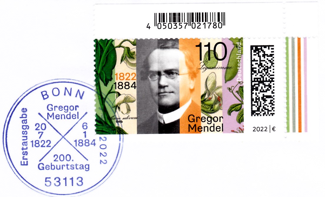 Zum 200. Geburtstag von Gregor Mendel ist bei der Deutschen Post eine Marke (MiNr 3699) erschienen. Sie zeigt ein Porträt von Gregor Mendel und Darstellungen zur Speiseerbse (Pisum sativum) nach Details einer Illustration aus dem Buch "Flora von Deutschland, Österreich und der Schweiz" (1885) von Prof. Dr. Otto Wilhelm Thomé.