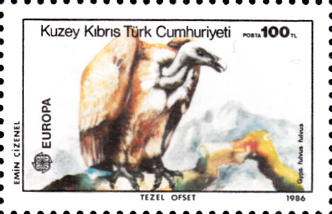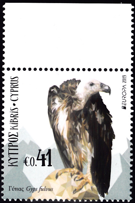 Auf einer Europamarke 2019 aus Zypern (MiNr 1408) wird ein Gänsegeier (Gyps fulvus) gezeigt. Hier zeige ich eine vierseitig gezähnte Marke (MiNr 1408 A).