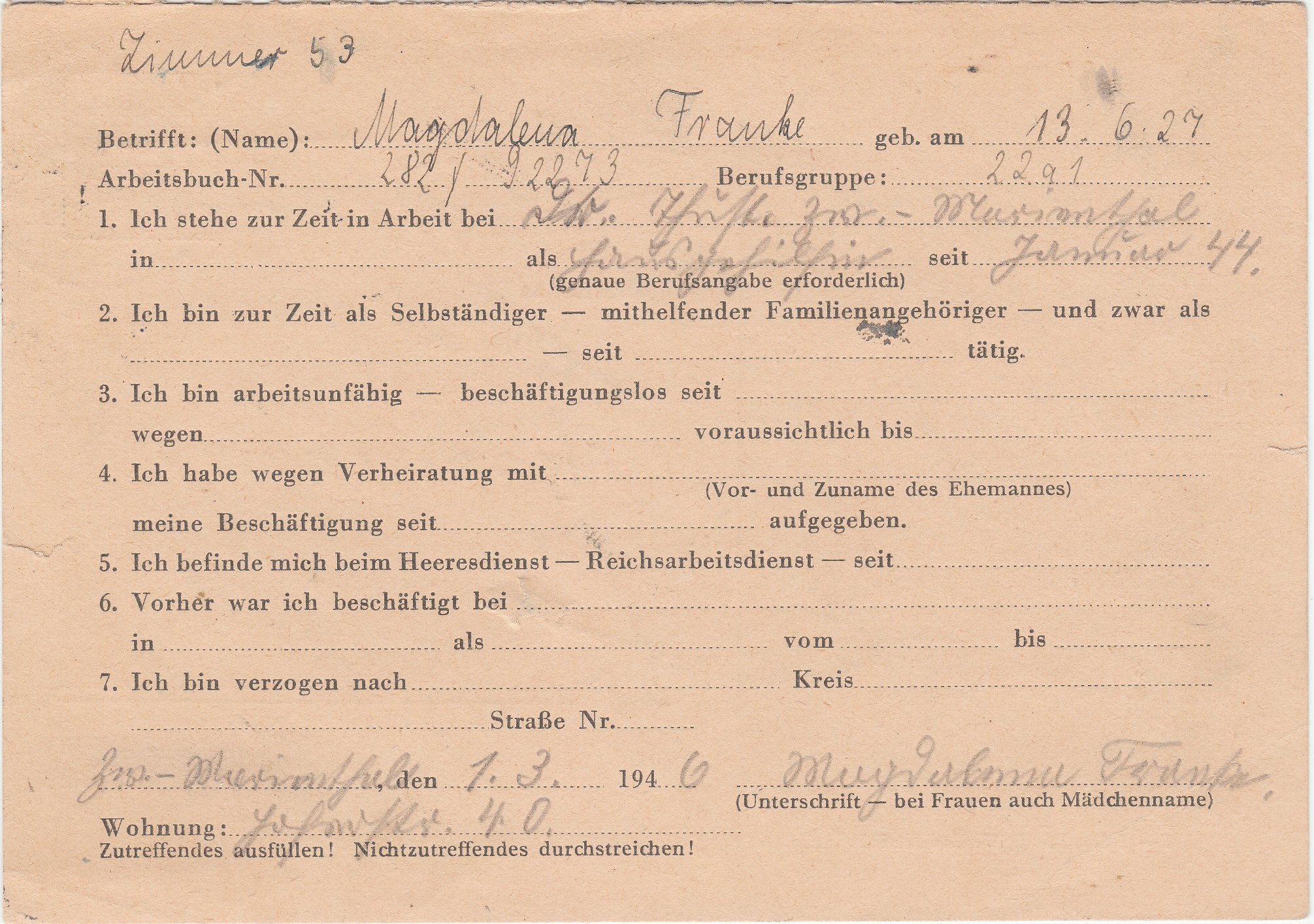 Der rückseitige Vordruck dieses Beleges wurde am 01.03.1946 ausgefüllt: