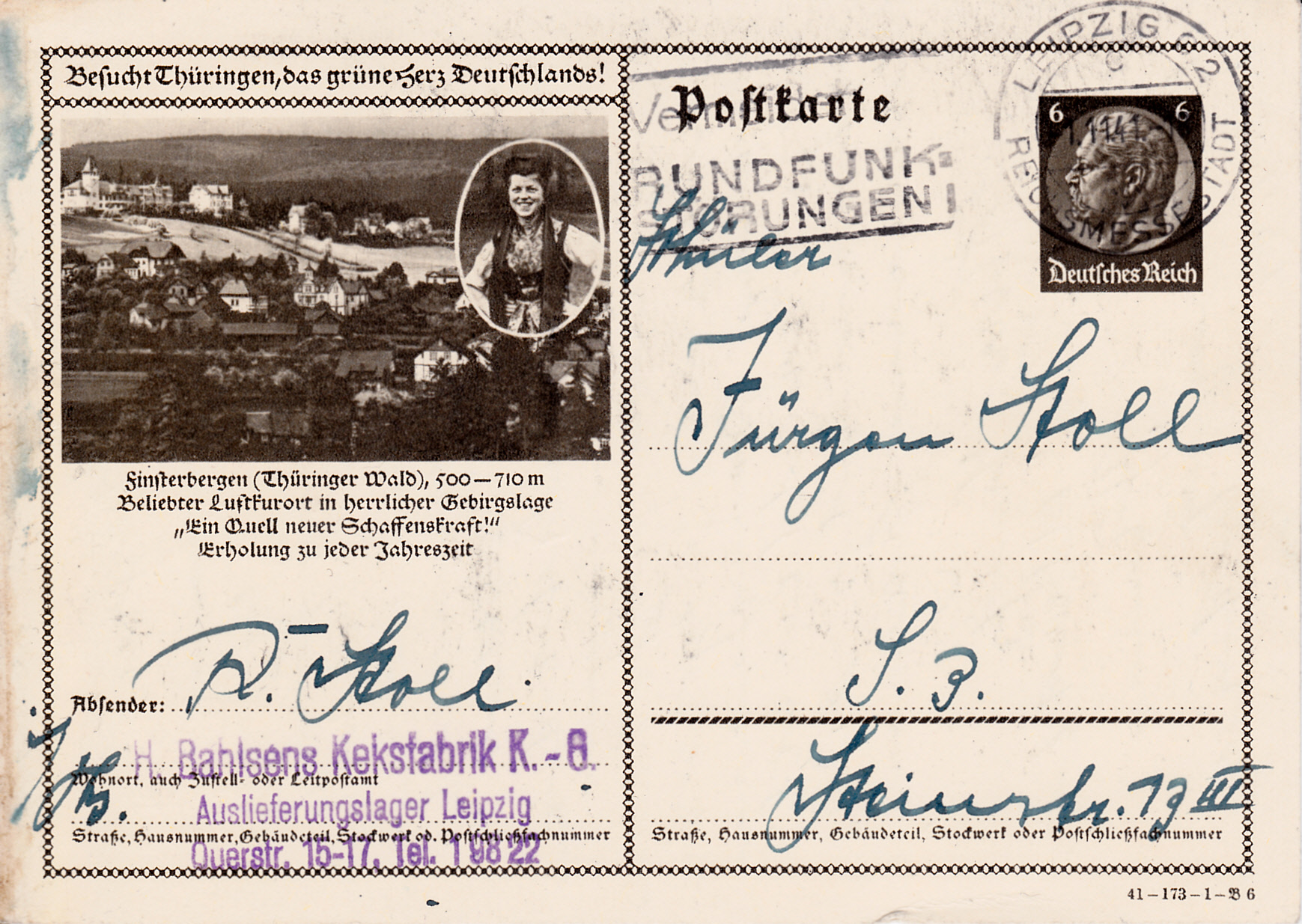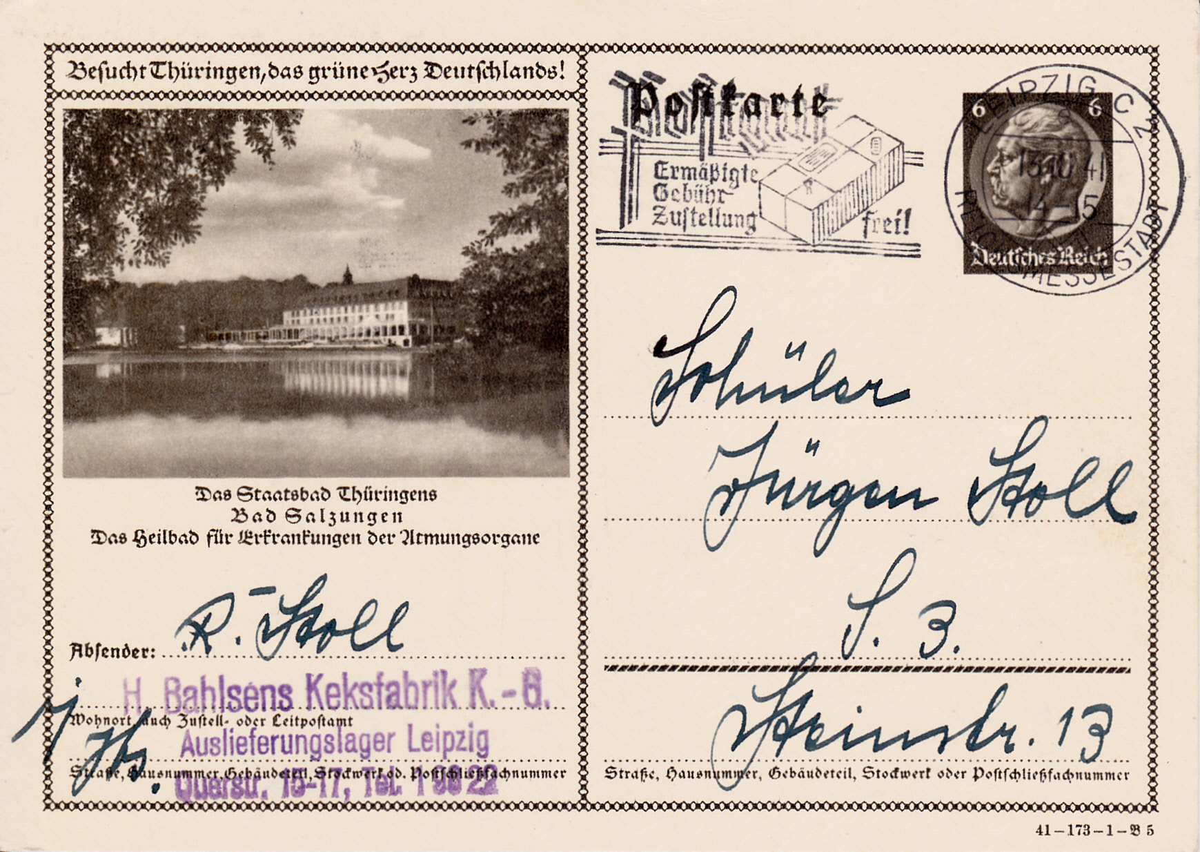 Diese Bildpostkarte 1941 (Serie 173 Bild 4) für Tabarz (Thüringer Wald) unterscheidet sich von einer Vorjahrskarte auch wieder nur im Druckvermerk.